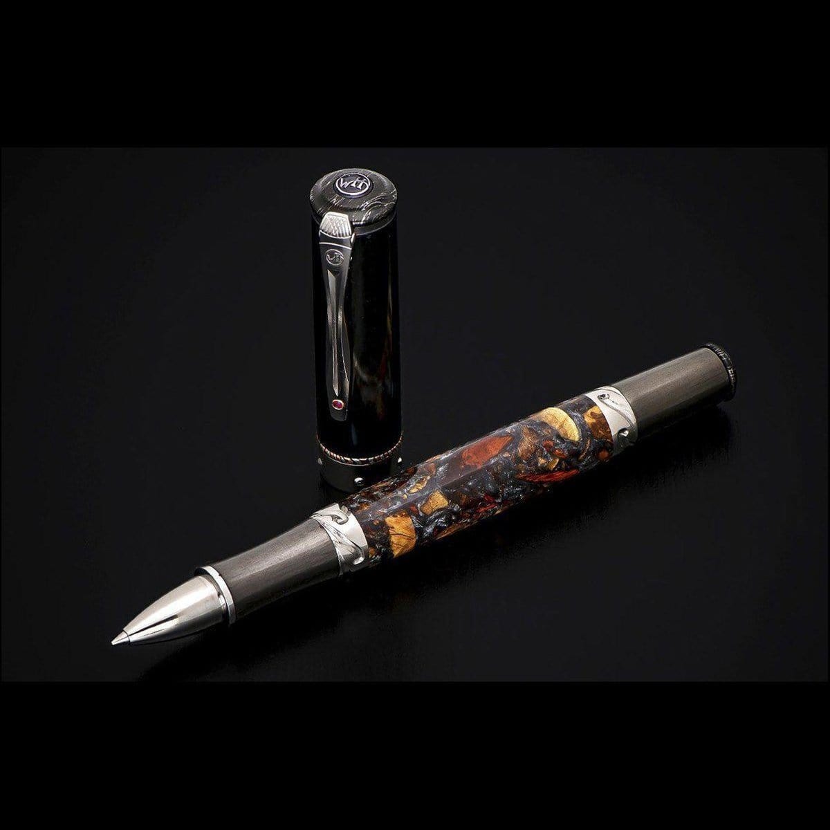 The Cabernet 'Abstract' features an intricate barrel in crushed amboyna burl wood in resin, and a light structure in aerospace grade titanium and aluminum. The accents on the carbon fiber cap are in mokume gane and titanium, and the pocket clip is set with a Blazing Red topaz gemstone. This writing instrument also features William Henry's patent-pending Wavelock™ cap closure system.