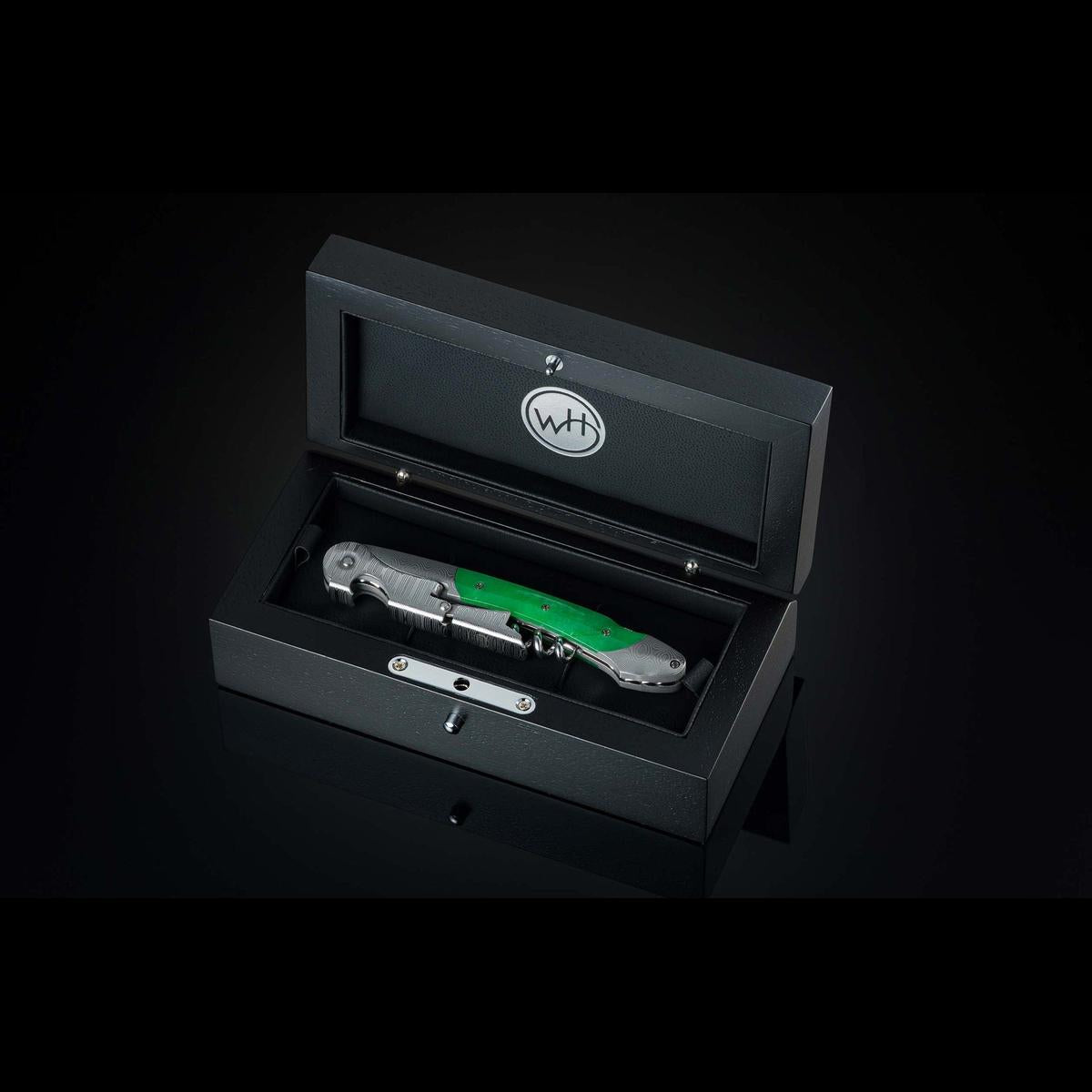 The William Henry 'Canopy' is a double hinged sommelier’s corkscrew featuring a Damascus steel frame, lever, and foil cutter. This fine entertainer's statement piece also features stunning Jade inlays that draw inspiration from the lush vineyards that produce our favorite wines. As a finishing touch, file work along the entire spine showcases the attention to detail that we are known for– because a story-rich wine deserves a story-rich opening.