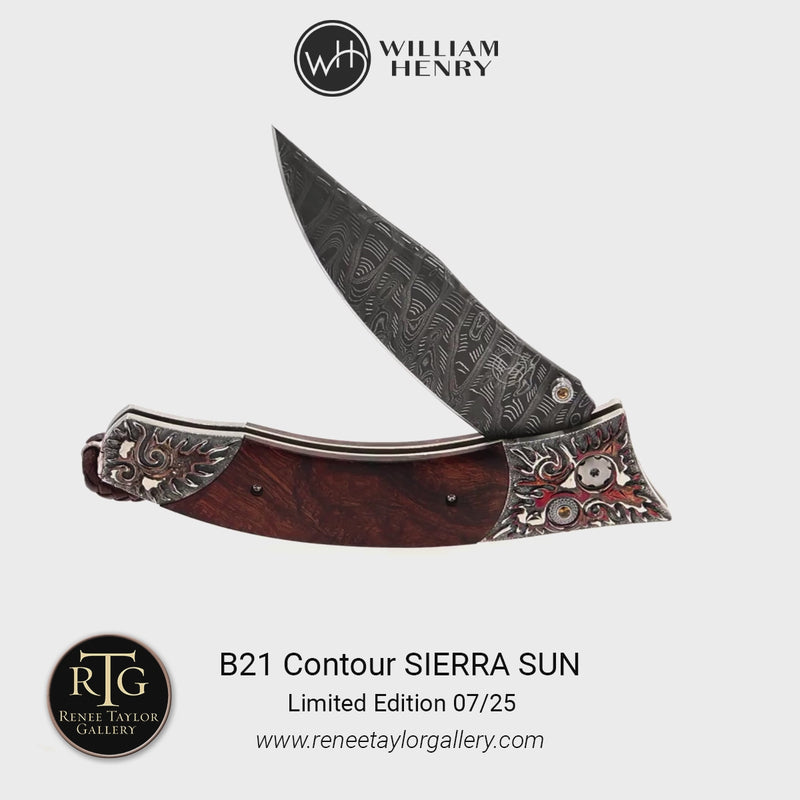 The Contour is an exquisite fusion of elegant lines, graceful curves, and exquisite materials. A bold interpretation of a timeless design, the 'Sierra Sun' also features some of the most exotic materials and hand-forged metals that are the hallmark of William Henry's collections; a timeless heirloom to be proudly worn and used for a lifetime before being handed-down to another generation.