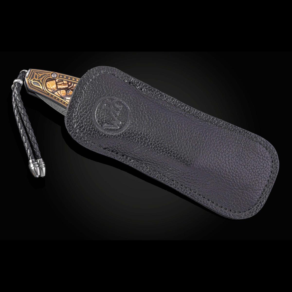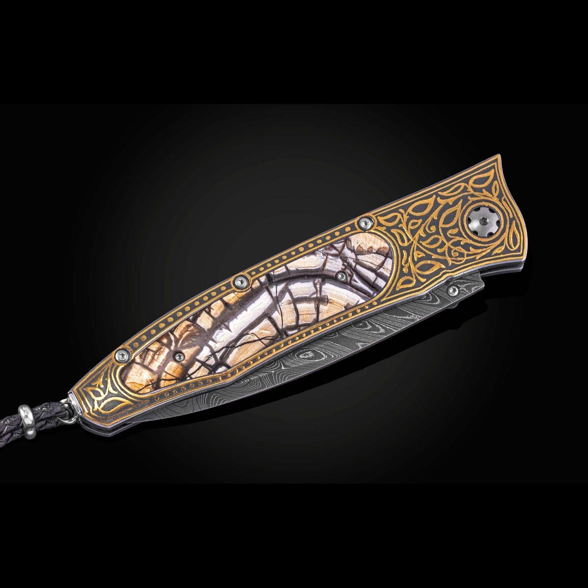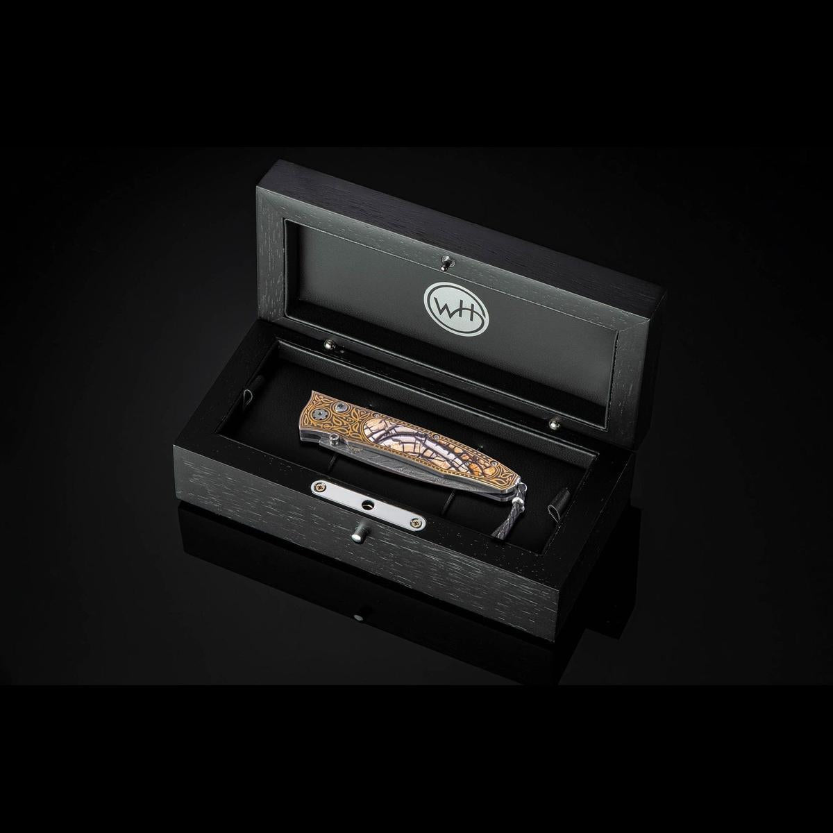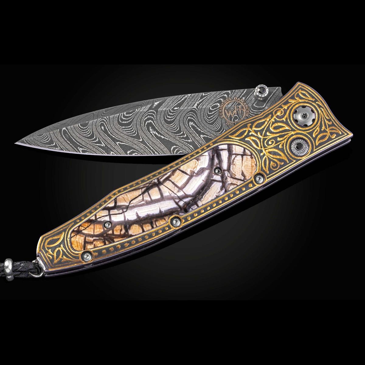 The Gentac ‘Goldrush’ features a mesmerizing frame in 24K gold Koftgari (the ancient Indian technique of inlaying gold and/or sterling silver in tool-steel), inlaid with 10,000 year-old fossil Woolly Mammoth tusk. The blade is hand-forged 'Boomerang' damascus by Chad Nichols; the one-hand button lock and the thumb stud are set spinel gemstones. An exceptional design that offers rigorous performance in a sleek, comfortable knife, the Gentac is also the perfect canvas to showcase William Henry’s range of exotic materials and techniques. The ‘Goldrush’ features some of the exotic materials and forged metals that are the hallmark of William Henry's collections.