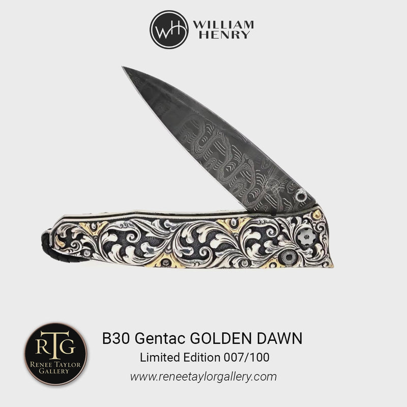 An exceptional design that offers rigorous performance in a sleek, comfortable knife, the Gentac is also the perfect canvas to showcase William Henry’s range of exotic materials and techniques. The ‘Golden Dawn’ features some of the unique materials, artistry, and metals that are the hallmark of William Henry's collections.