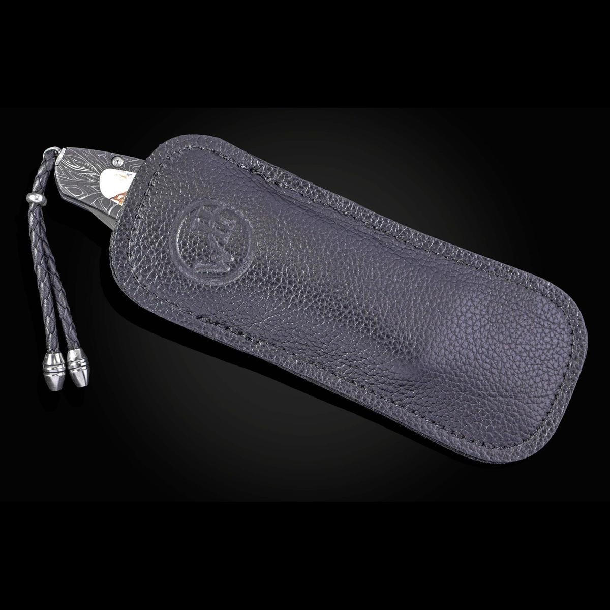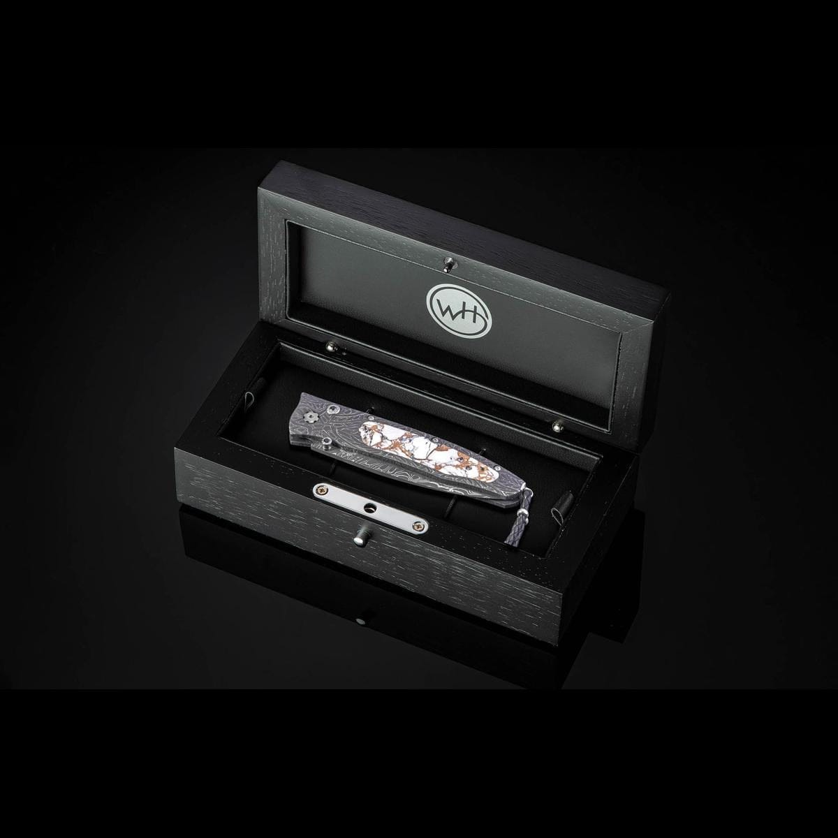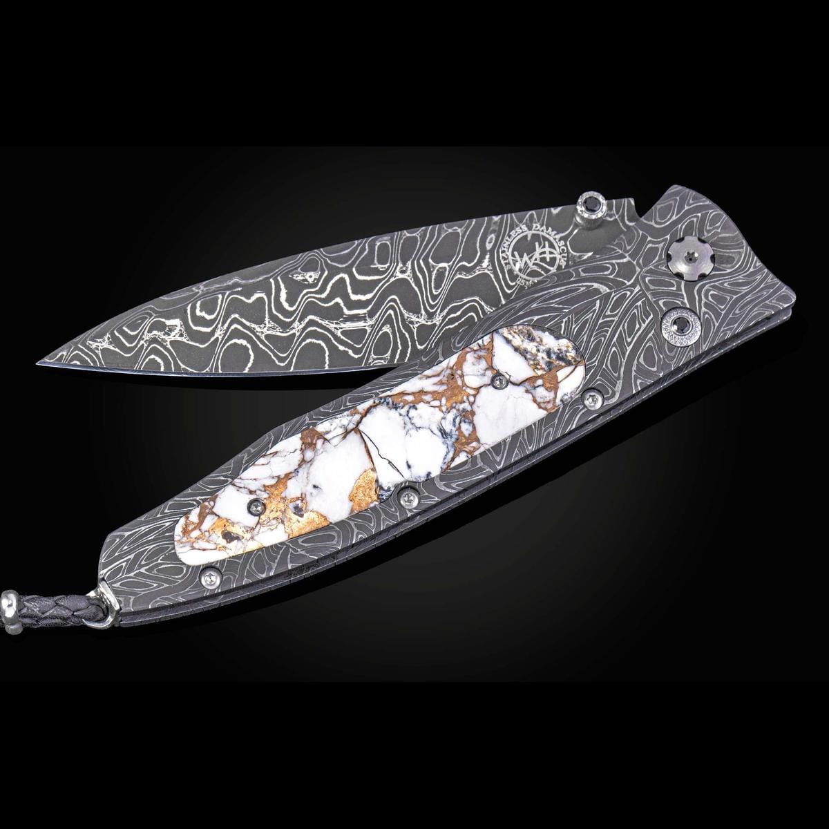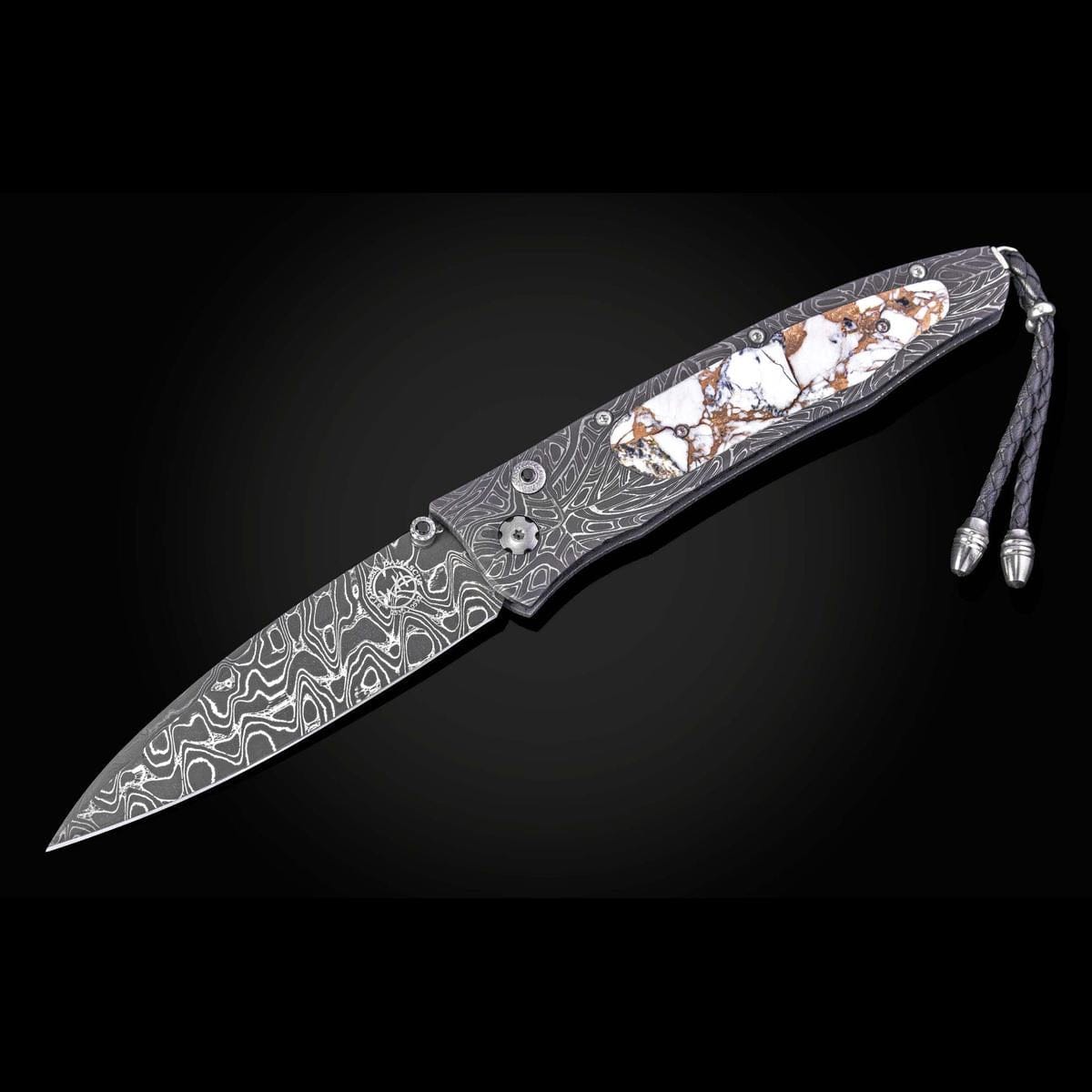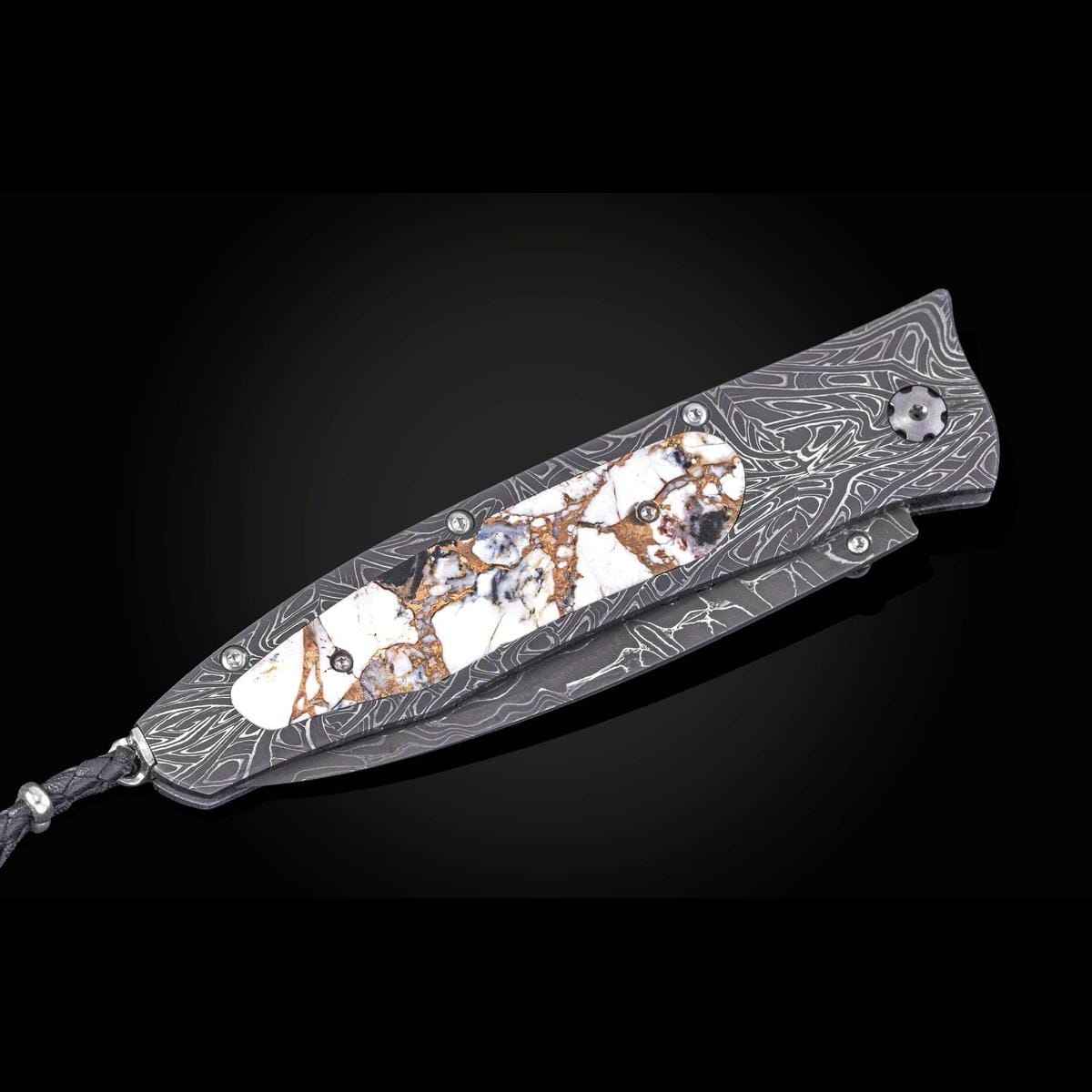 The Gentac ‘White Buffalo' features a beautiful frame in hand-forged 'Brain Wave' damascus by Chad Nichols, inlaid with a stunning scale of White Buffalo turquoise with a bronze matrix. The blade is hand-forged 'Intrepid' damascus steel by Chad Nichols; the one-hand button lock and the thumb stud are set with spinel gemstones. An exceptional design that offers rigorous performance in a sleek, comfortable knife, the Gentac is also the perfect canvas to showcase William Henry’s range of exotic materials and techniques. The ‘White Buffalo’ features some of the exotic materials and forged metals that are the hallmark of William Henry's collections; a distinctive personality statement to be worn and used for a lifetime.