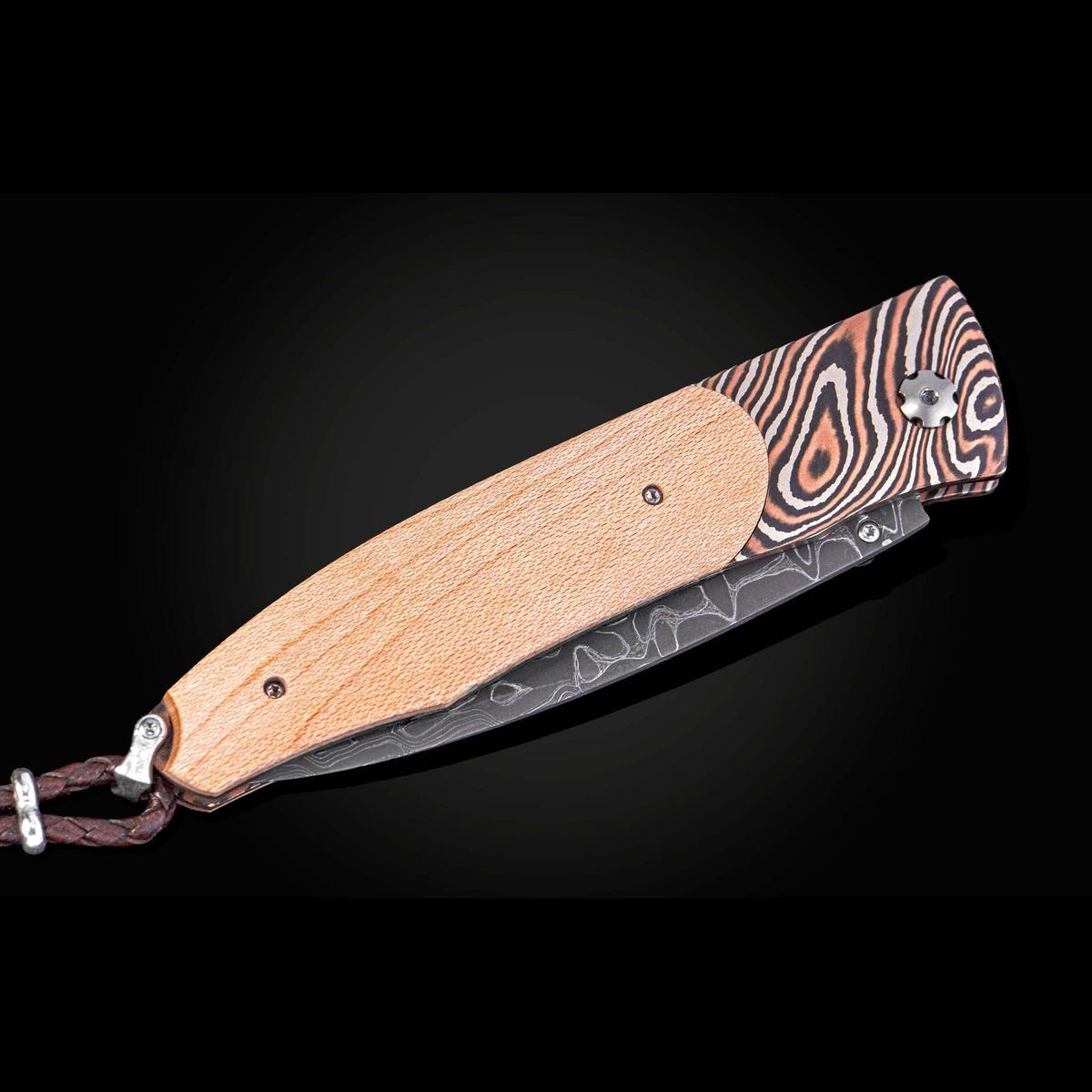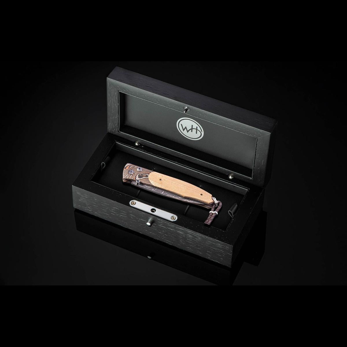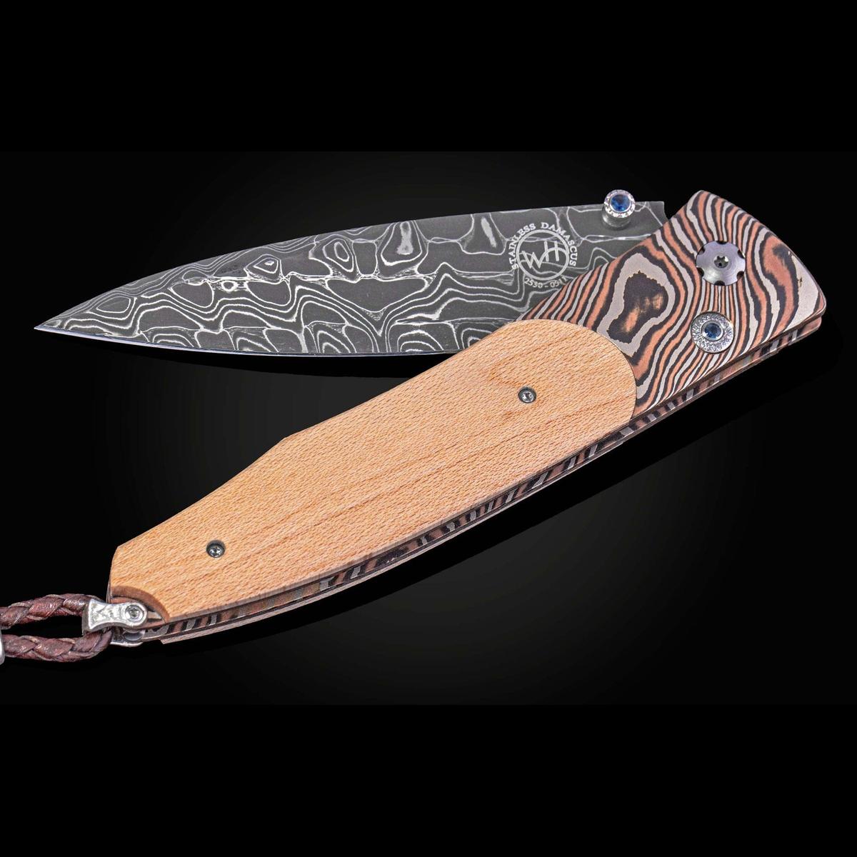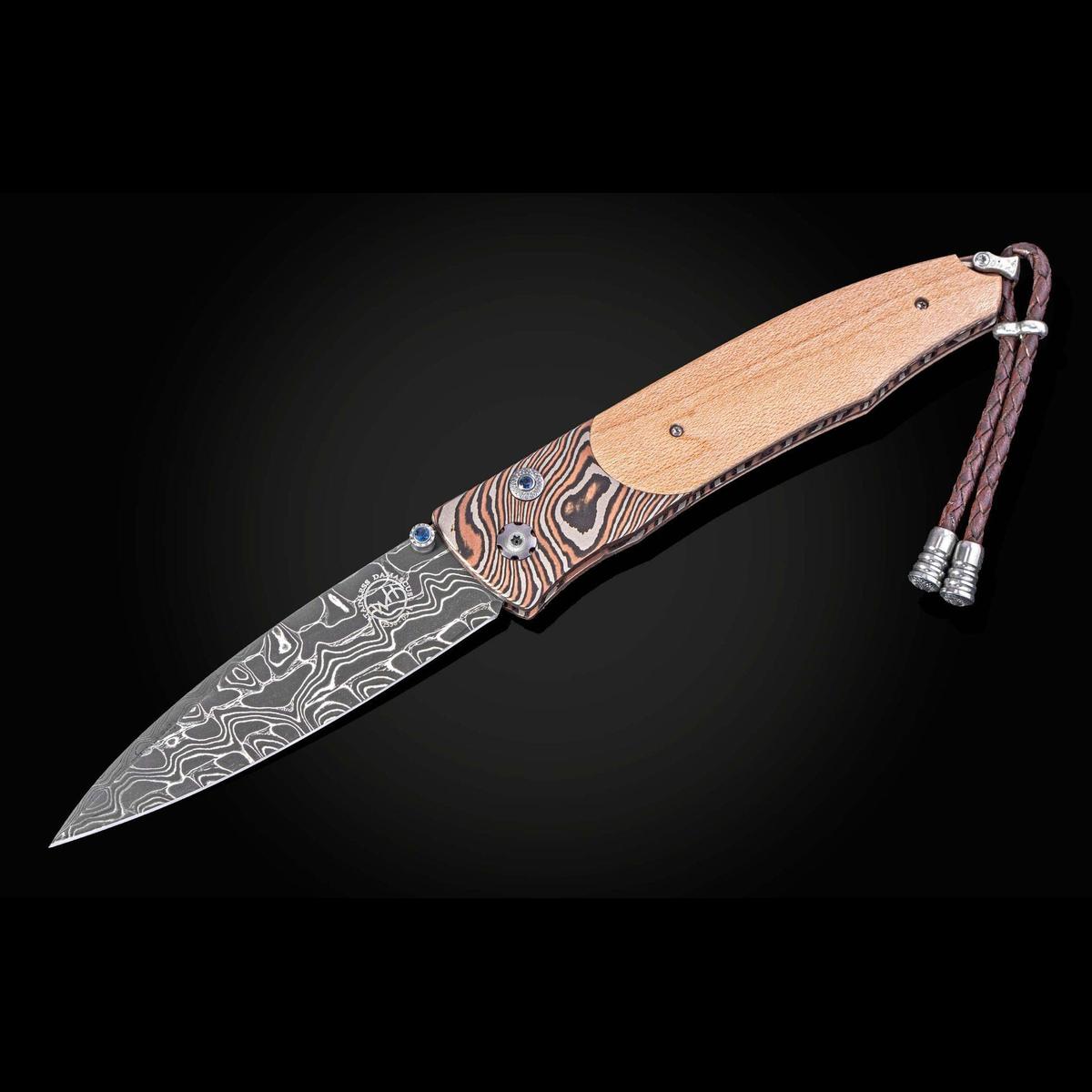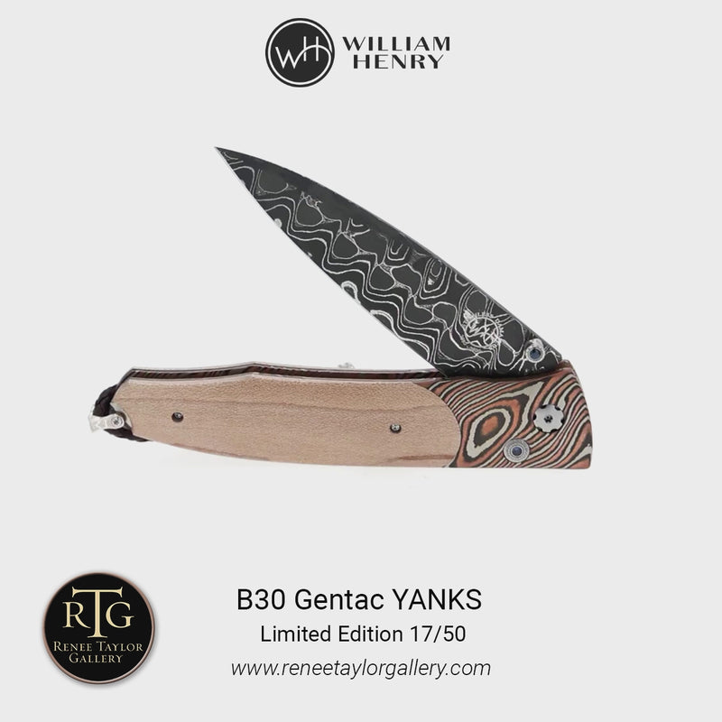 The Gentac ‘Yanks’ features a beautiful frame in hand-forged 'Twist' Mokume Gane by Mike Sakmar, inlaid with reclaimed wood from the 1923 Yankee Stadium renovation. The blade is hand-forged 'Intrepid' damascus steel by Chad Nichols; the one-hand button lock and the thumb stud are set with sapphire gemstones. An exceptional design that offers rigorous performance in a sleek, comfortable knife, the Gentac is also the perfect canvas to showcase William Henry’s range of exotic materials and techniques. The ‘Yanks’ features some of the exotic materials and forged metals that are the hallmark of William Henry's collections; a distinctive personality statement to be worn and used for a lifetime.