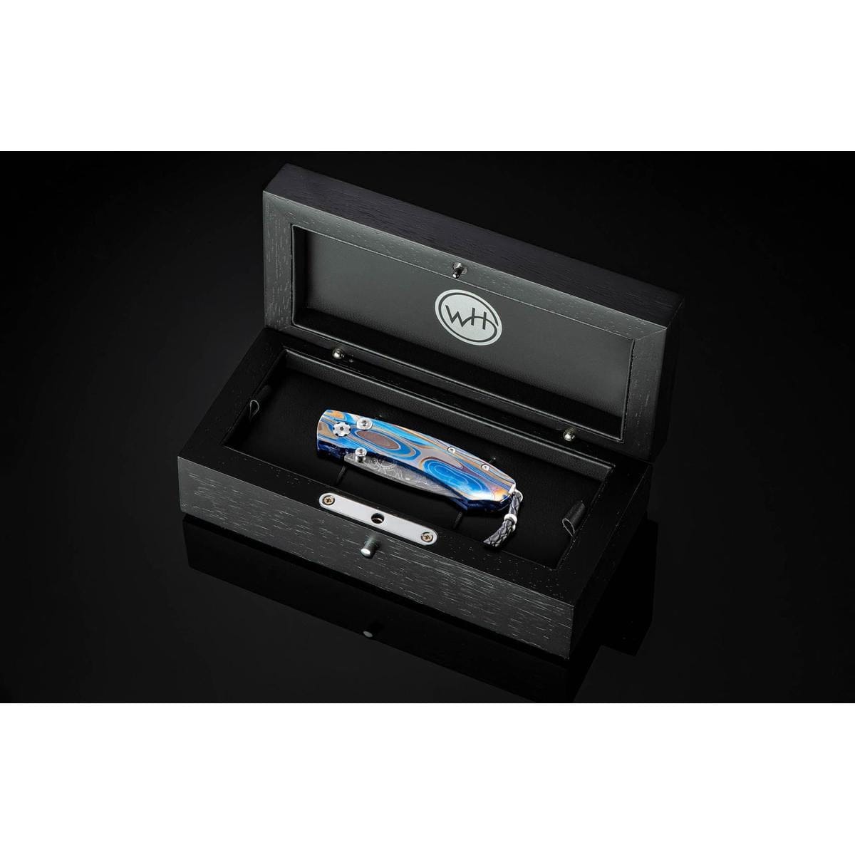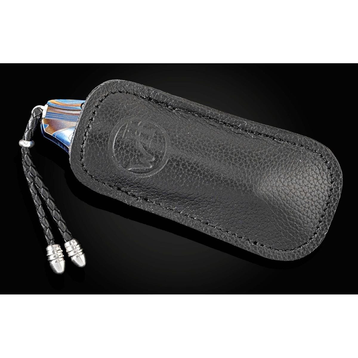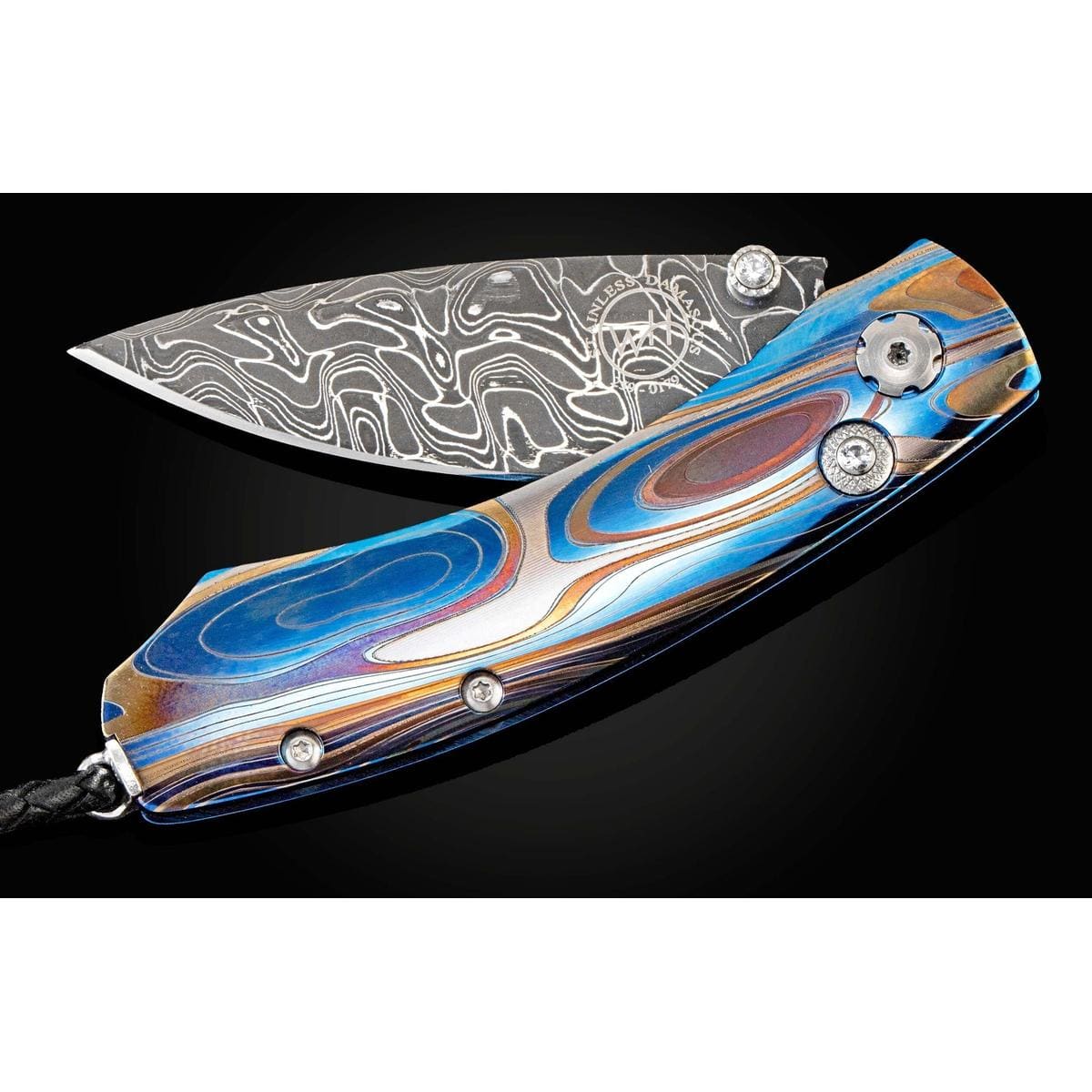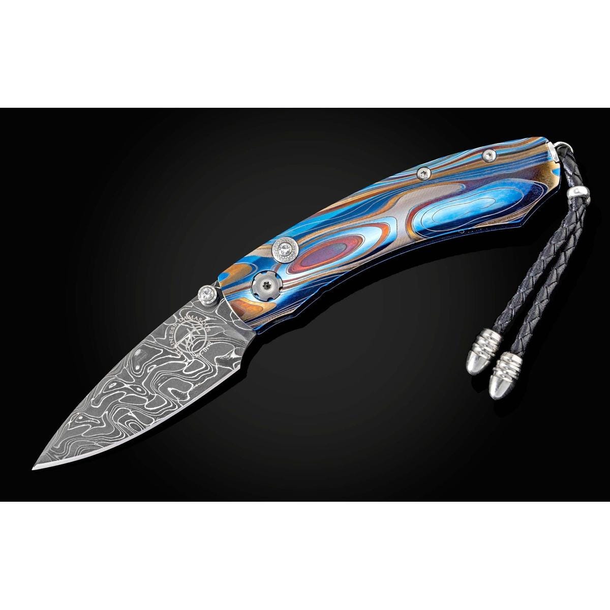 The Kestrel 'Galassia' features a light and resilient titanium frame, anodized blue and laser engraved. The blade is hand-forged 'Intrepid' damascus by Chad Nichols; the one-hand button lock and thumb stud are set with white topaz gemstones. The Kestrel is a compact but versatile folder that works and presents beautifully in any situation; the design, which offers a deep finger groove at the intersection between the handle and blade, makes this knife remarkably comfortable in the hand while being very small and easy to carry. The ‘Galassia’ is an elegant and distinctive personality statement to be worn and used for a lifetime.