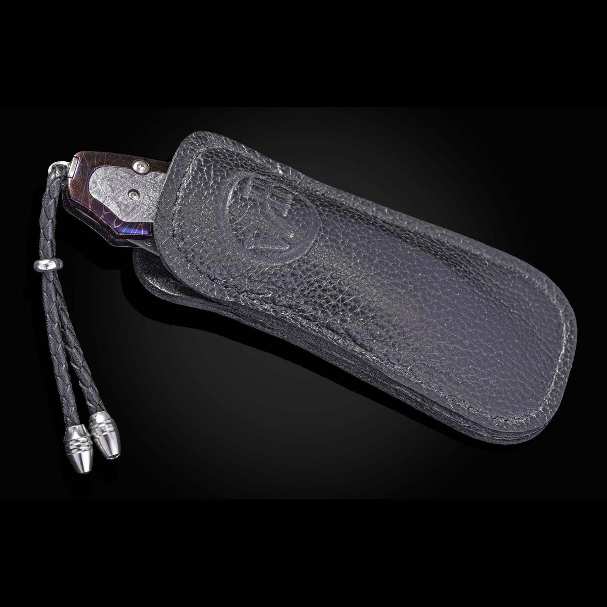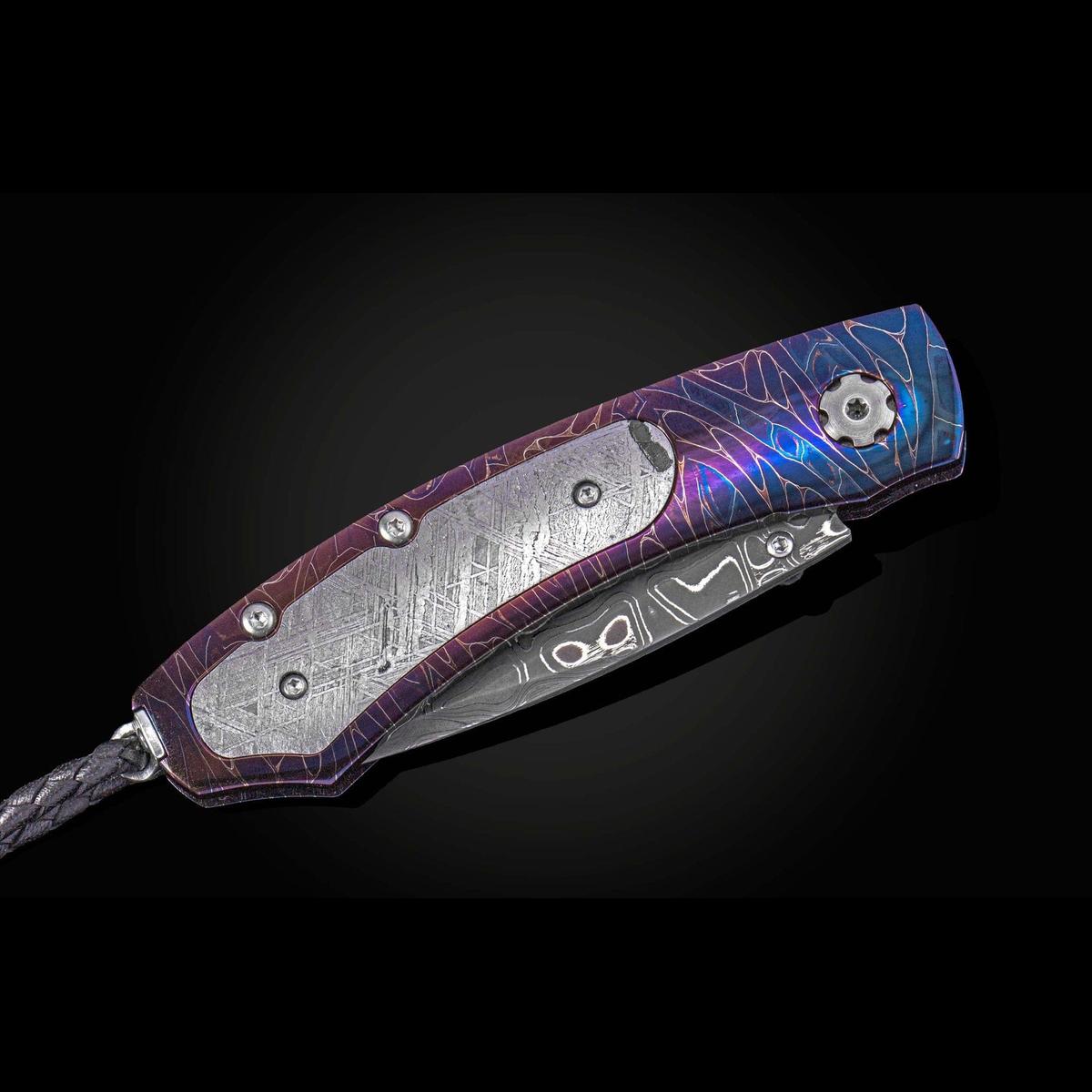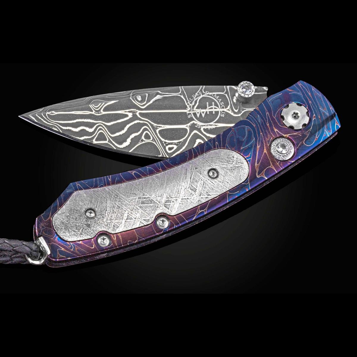 The Kestrel 'Skyfall' features a beautiful frame in heat-blued 'Rolling Rock' damascus steel by Chad Nichols, inlaid with a mesmerizing meteorite scale (a section of the Gibeon meteorite which fell in the desert of Namibia in prehistoric times). The blade is hand-forged 'Intrepid' damascus, also by Chad Nichols; the one-hand button lock and the thumb stud are set with white topaz gemstones.