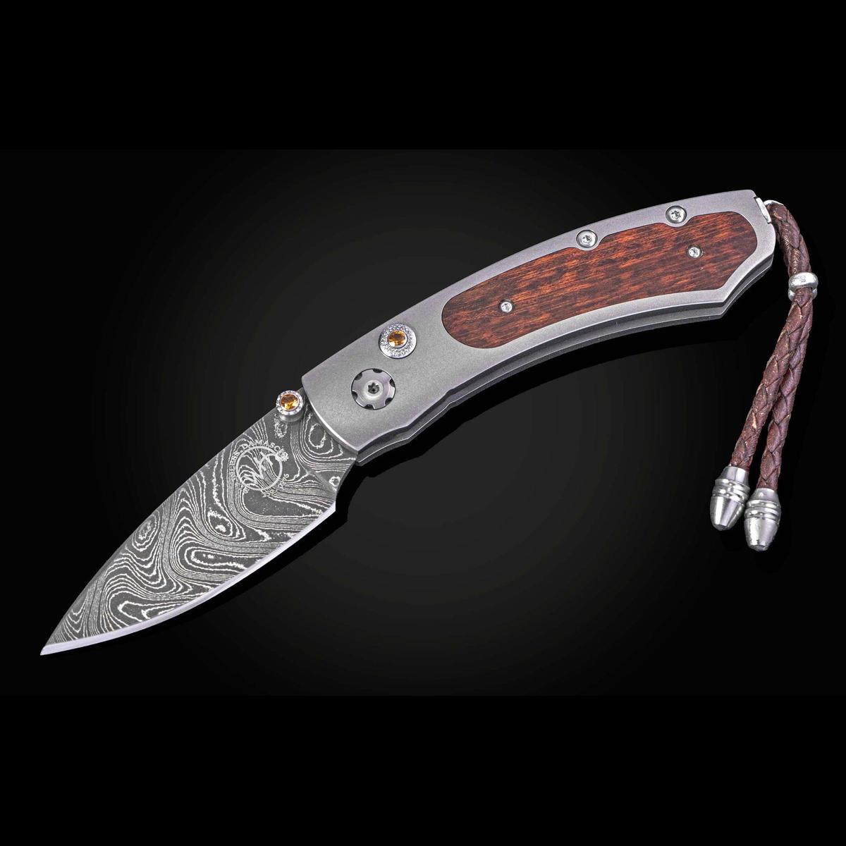 The Kestrel 'Slither' features a sleek and resilient frame in aerospace grade titanium, inlaid with a beautiful piece of snakewood. The blade is hand-forged 'Boomerang' damascus by Chad Nichols; the one-hand button lock and the thumb stud are set with citrine gemstones.