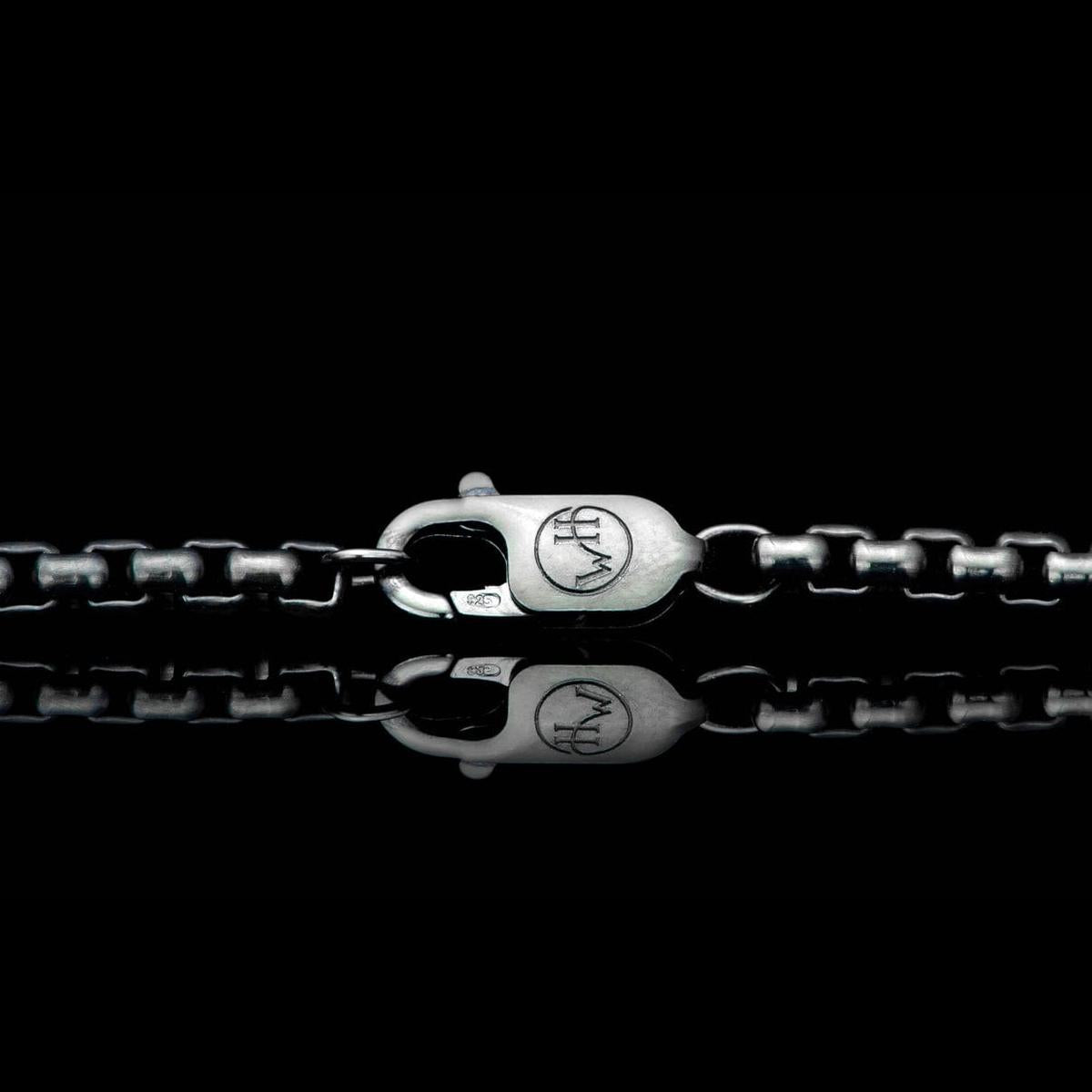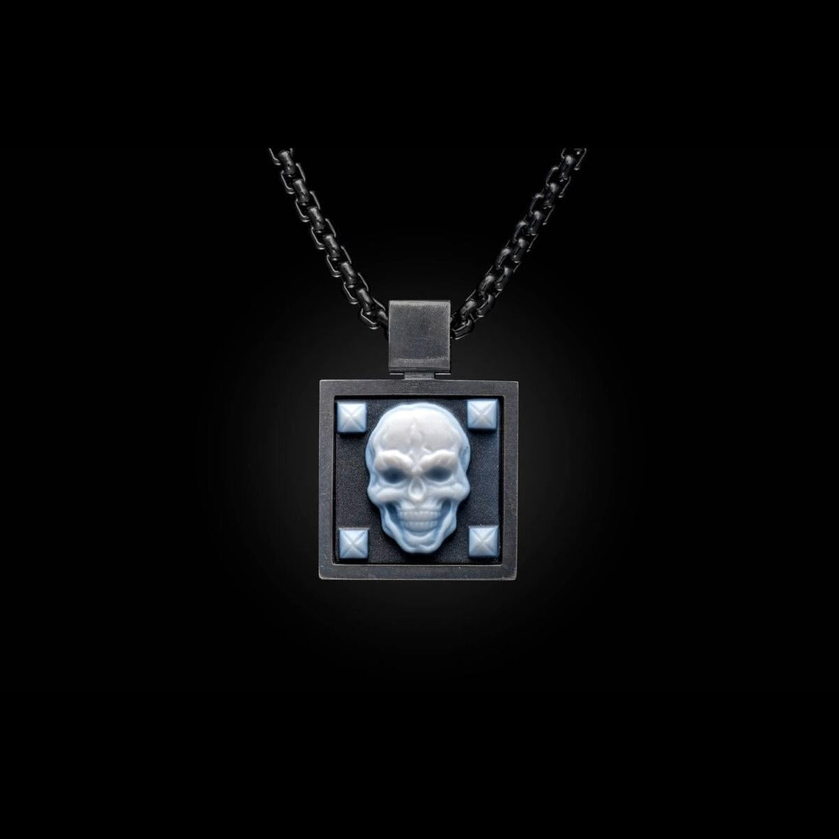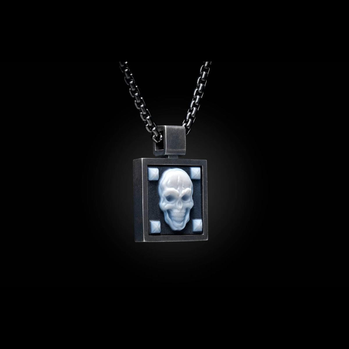 The ‘Buccaneer’ features an oxidized sterling silver pendant inlaid with an intricately carved banded agate skull by Herbert Stephan. The agate sourced for this piece is of the highest quality, and its rich contrast adds a level of nuance that is quite uncommon. This remarkable pendant is accompanied by a black PVD coated chain that complements the deep tones of the carved agate perfectly.