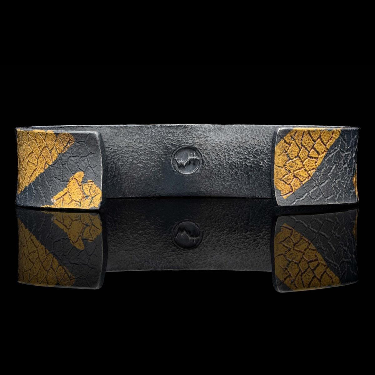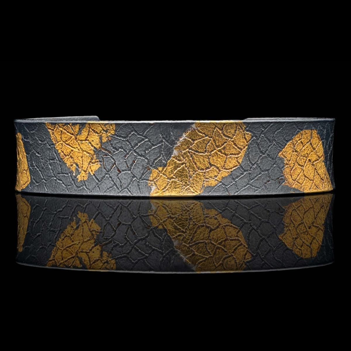 Follow the contours of this wide cuff bracelet, crafted in patinated sterling silver with diffusion bonded 23.5k gold and engraved details that give this piece an organic look achievable only through meticulous handcraft. These elements, including the unique application of the Keum-Boo technique, embody the artistry of both ancient and contemporary design.