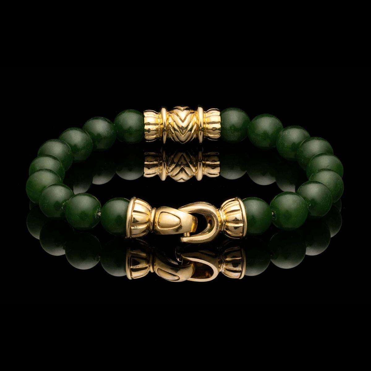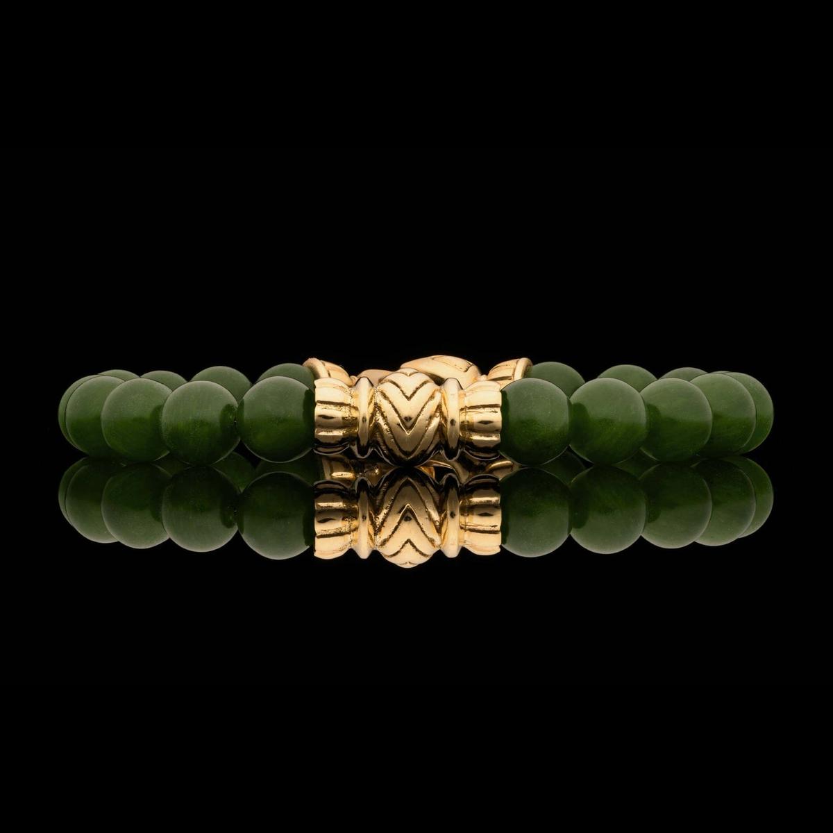Indulge in the radiance of our ‘Pilas’ beaded bracelet. Inspired by Mayan Deco Revival architecture, this piece features green jade beads flanked by lustrous 18k yellow gold end caps and focal bead inspired by Aztec and Mayan geometry. This bracelet exudes luxury with a nod to timeless heritage and contemporary design, inviting you to adorn yourself with history reimagined.