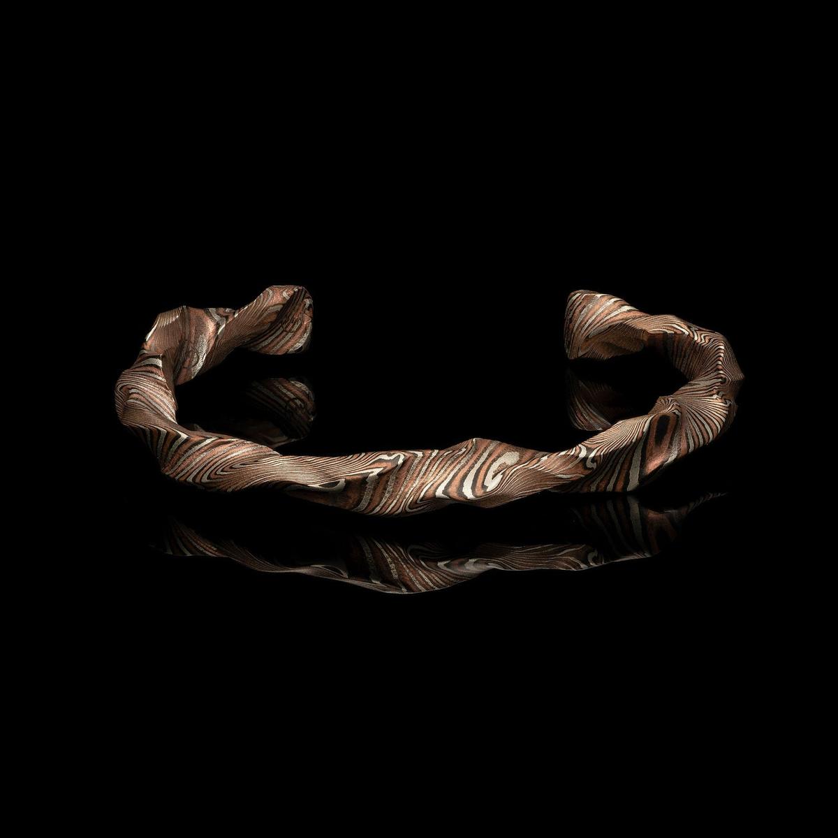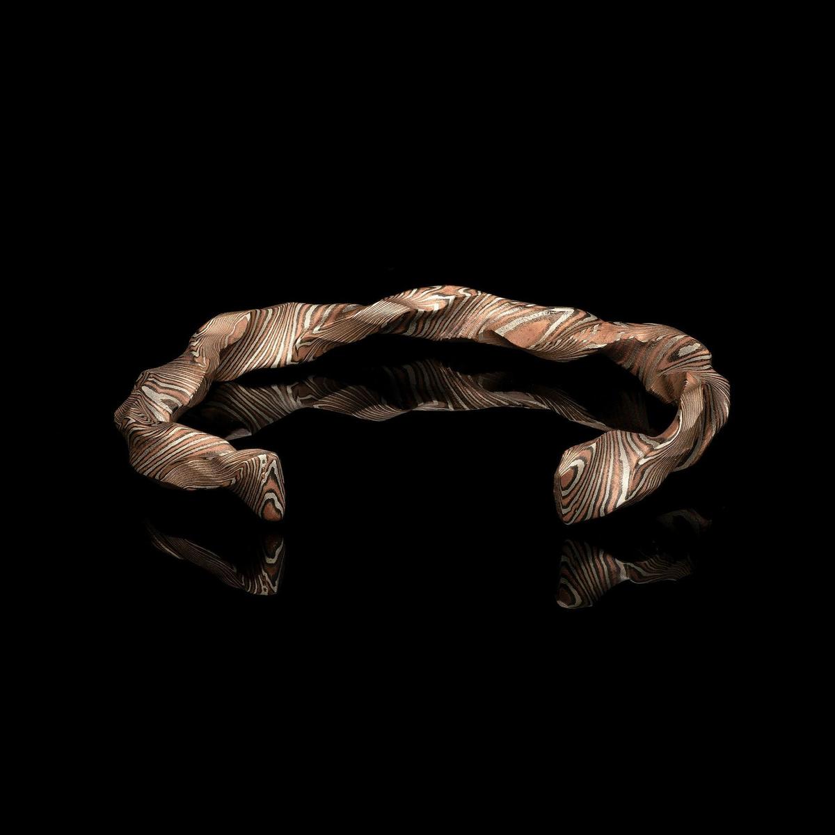 This mokume gane cuff showcases the full richness of its copper, brass, and nickel silver layers. Broad, twisting surfaces reveal expanded patterns and sculptural curves, offering a substantial, modern silhouette with a sophisticated, cutting-edge aesthetic.
