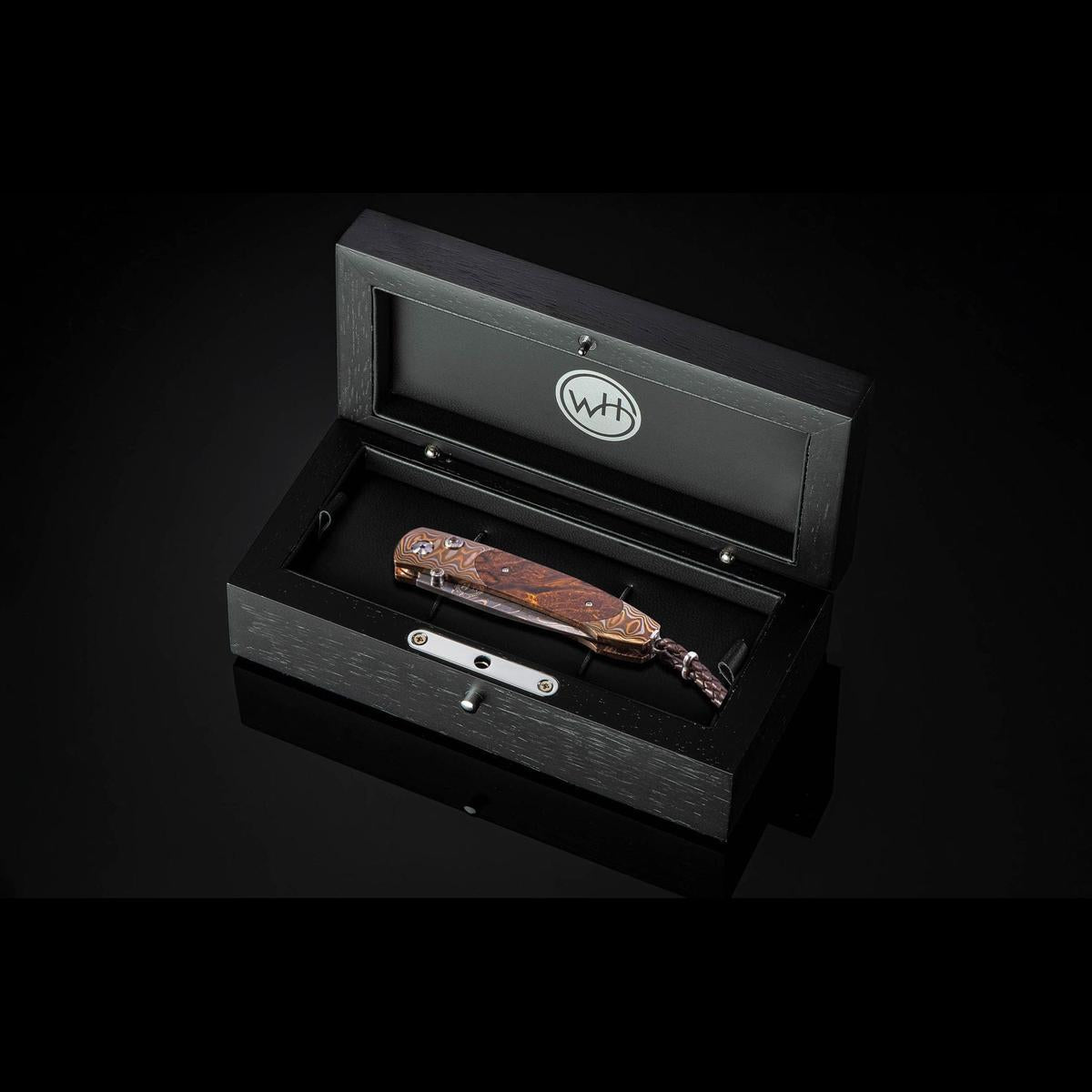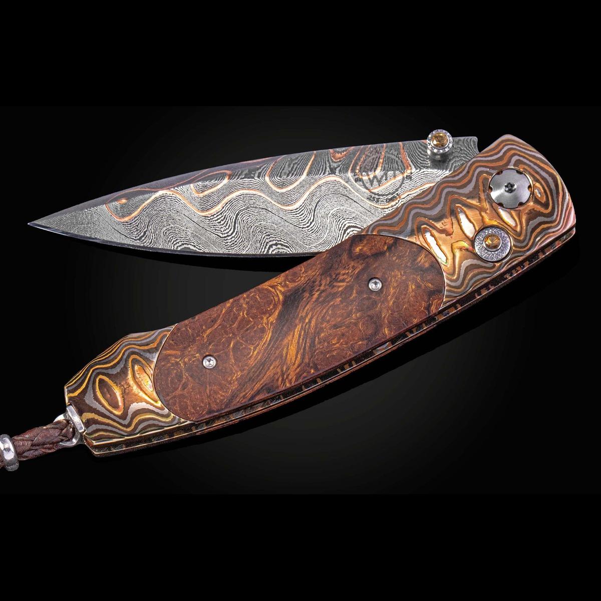 The Monarch 'Fire Storm' features a beautiful frame in head-colored 'Wave Mokume', inlaid with desert ironwood scales. The blade is hand-forged 'Firestorm' damascus by Baker Forge. The one-hand button lock and thumb stud are set with citrine gemstones. The Monarch is a simple design that is easy on the eye and effortless in the hand; the elegant shape of the handle on this model is also an ideal canvas to showcase several of William Henry's most admired exotic materials. The 'Fire Storm' is a rare and captivating personality statement to be worn and used for a lifetime before being handed down to another generation.