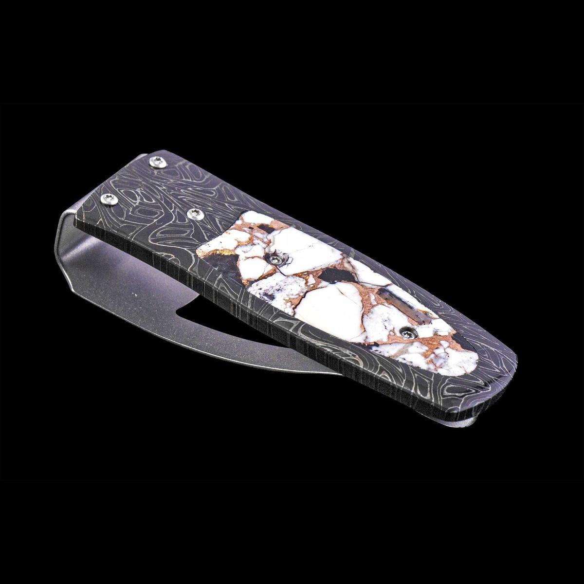 The Pharaoh ‘White Buffalo' features a frame hand-forged 'Brain Wave' damascus by Chad Nichols, and inlaid with White Buffalo Turquoise with a bronze matrix. The clip is machined and blast-polished from tempered stainless steel, with a beautiful engraving bright cut against the matte-finished background.