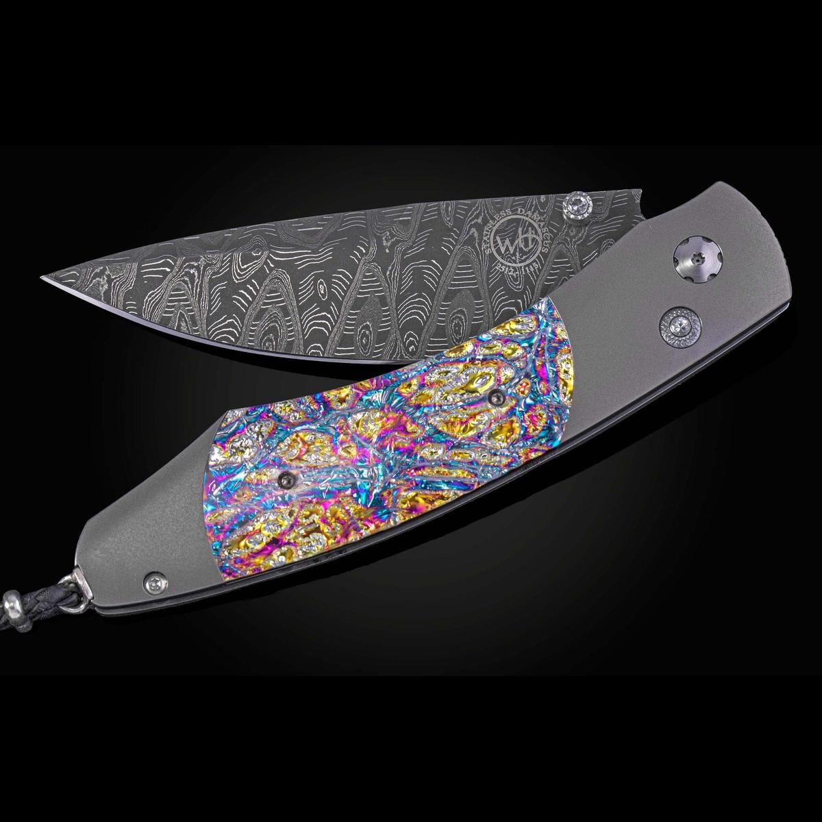 The Spearpoint ‘Sparkle' features a frame in aerospace-grade titanium, inlaid with 'Titanium Burl' Dichrolam®. The blade is hand-forged 'Hornets Nest' damascus by Mike Norris; the one-hand button lock and the thumb stud are set with white topaz gemstones.