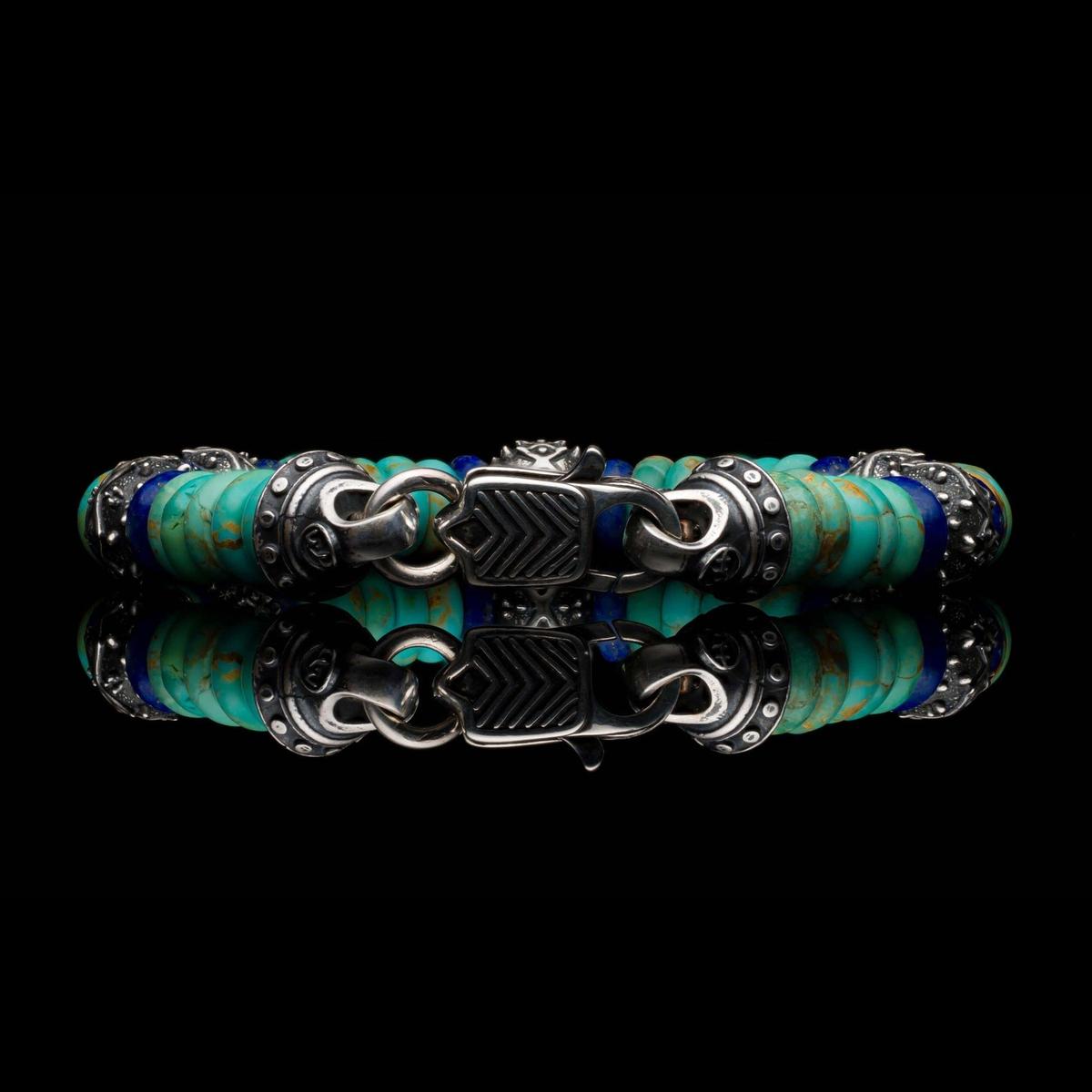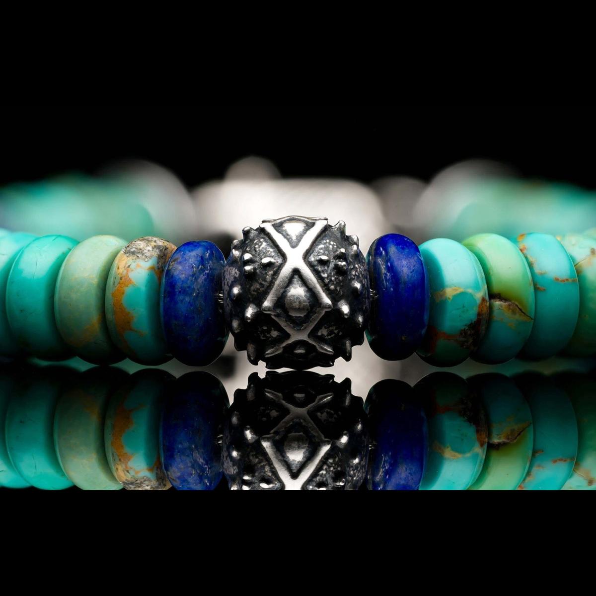 Vivid contrast, timeless elegance. Featuring Kingman turquoise and lapis lazuli rondelle beads, accented with sculpted sterling silver and a custom clasp. A striking blend of sky, sea, and stone-crafted for the modern collector.