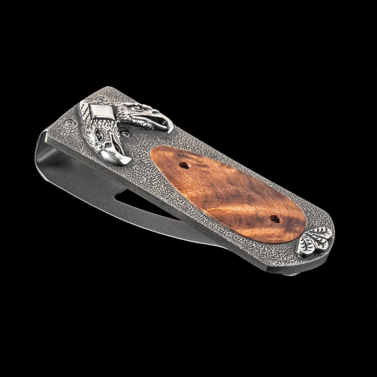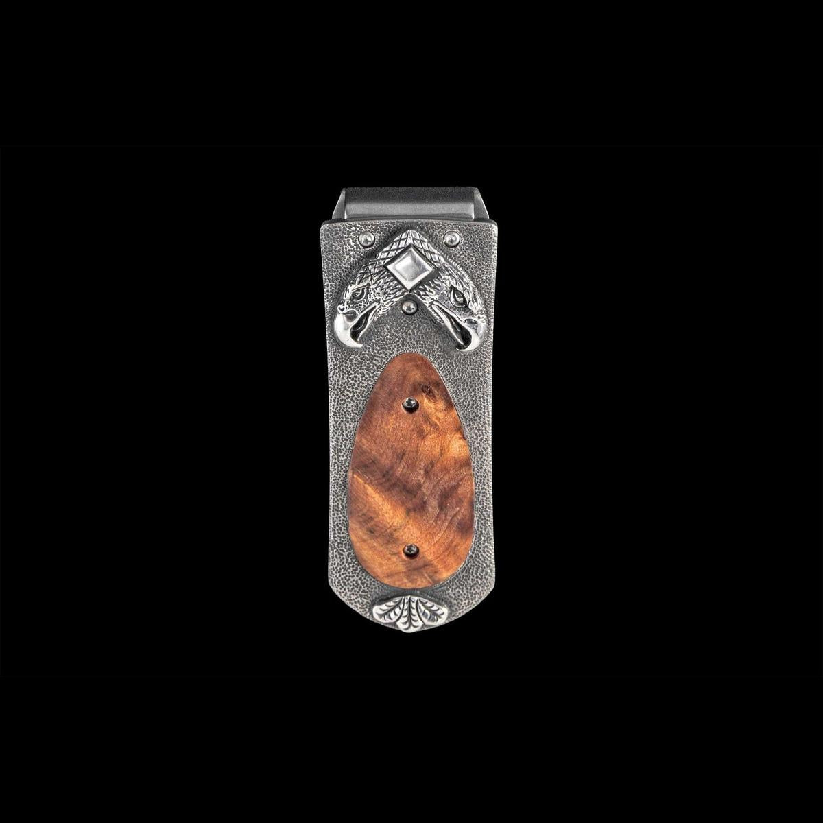 The Zurich ‘Thuya’ is a beautiful money clip featuring hand-carved sterling silver accents by Lee Downey, inlaid with thuya burl wood. The clip is machined and polished from tempered stainless steel, with a beautiful engraving bright cut against the matte-finished background. The ‘Thuya’ money clip is a beautiful, and functional personality statement featuring some of the unique materials and forged metals that are the hallmark of William Henry's collections; a timeless heirloom to be proudly worn and used for a lifetime before handing it down to another generation.