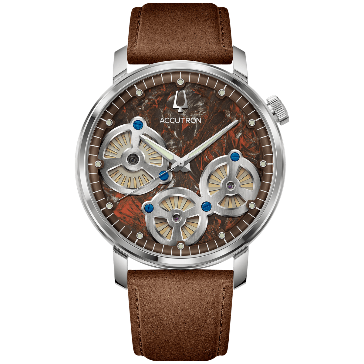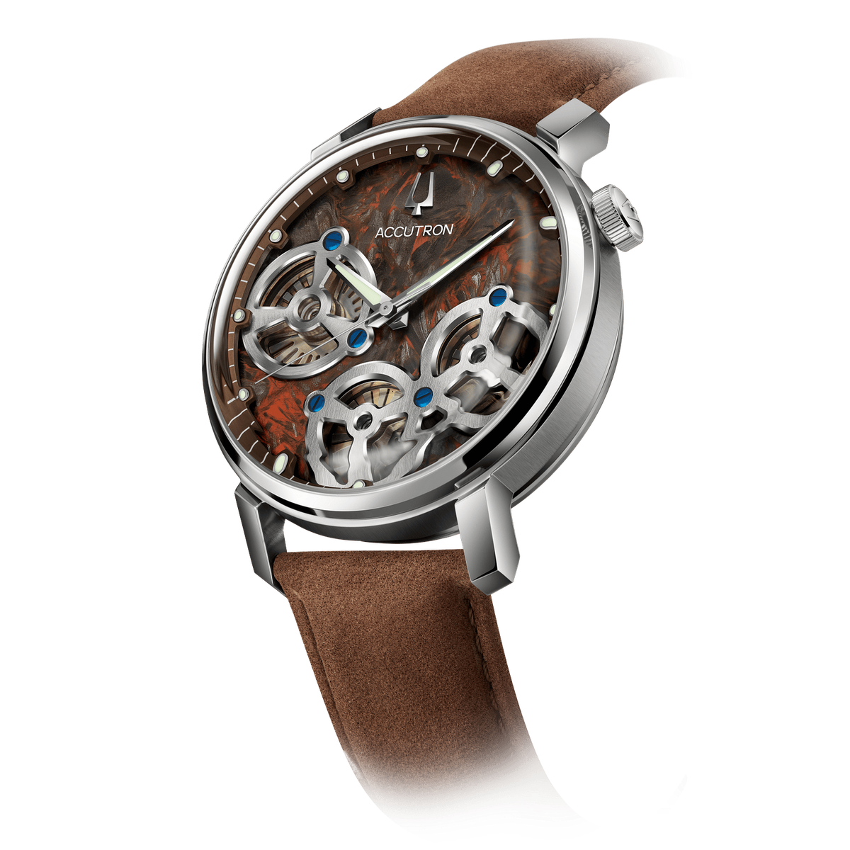 Accutron breaks the mold again with the Spaceview Evolution, now featuring striking forged carbon dials. An enigmatic swirl of color, the visual impact of the red forged carbon dial is enhanced by a new closed dial. The remaining apertures allow the wearer to admire the forged carbon’s evocative pattern as it sits in juxtaposition to the iconic spinning turbines and their silver-tone bridges and blue screws, while LumiNova hands and hour markers offer ideal legibility. Underpinning the exceptional dial is the groundbreaking NS30 electrostatic movement, the first of its kind, which is powered by twin turbines that harness energy created by even the slightest movement and deliver accuracy of -/+5 seconds per month. Housed in a stainless-steel case with a sapphire crystal and a matching luxurious brown suede strap with a folding clasp, the Accutron Spaceview Evolution Forged Carbon marks the latest in the ongoing story of the Electrostatic collection.