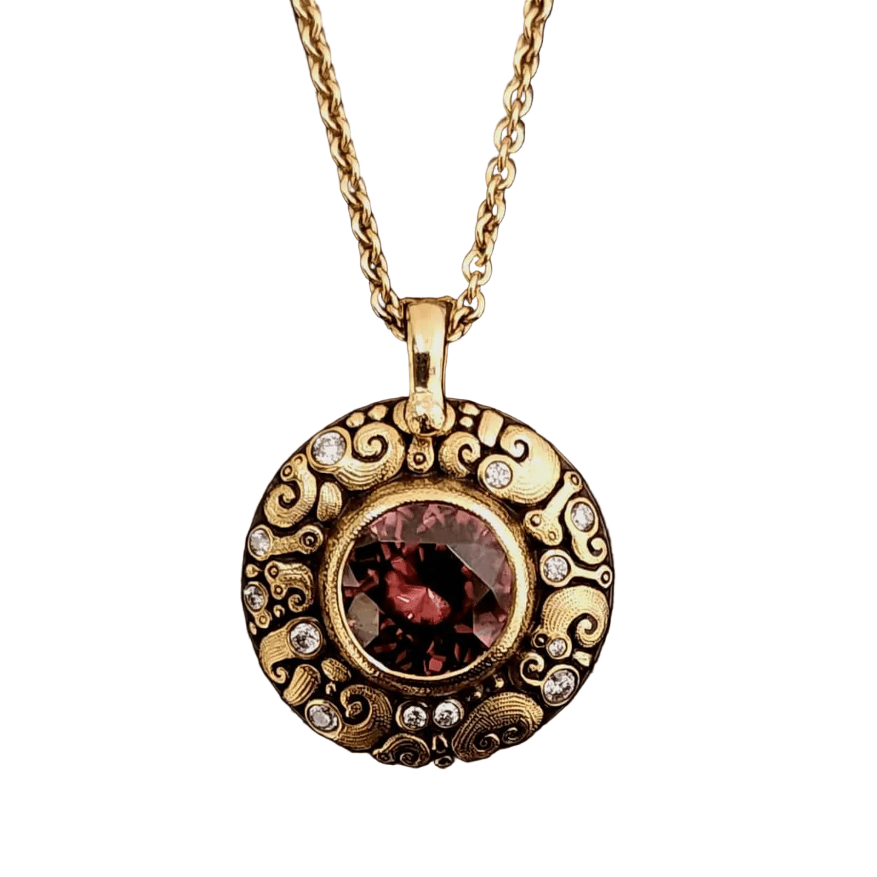 18K and Diamond 'Temptation' Pendant, CINNAMON ZIRCON (3.41Cts) Center Stone 8.5mm Round Faceted, 12 dias. (0.15ct.) on CH-1.9, 18K Cable Link Chain, Thickness 1.9mm, Length - 18 inches