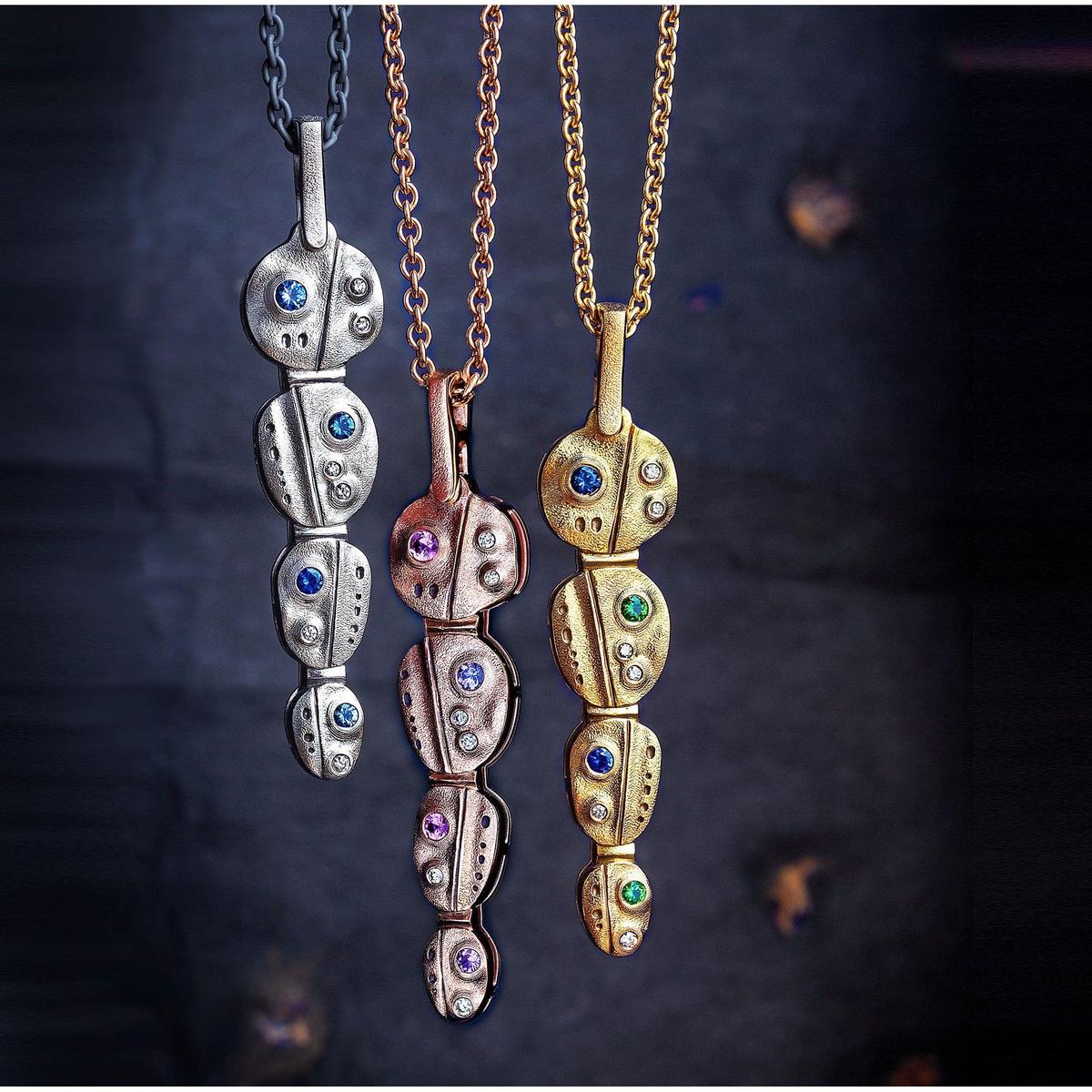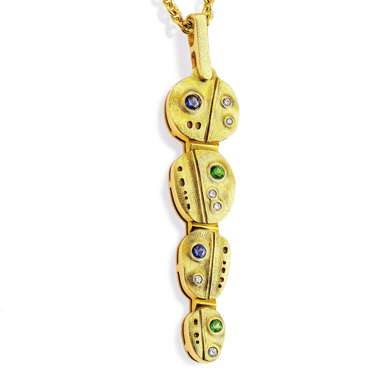 The pendant can be ordered in 18K Yellow or Rose Gold as well as Platinum. Custom color stone mixes are also available. Call for pricing on material or stone changes.