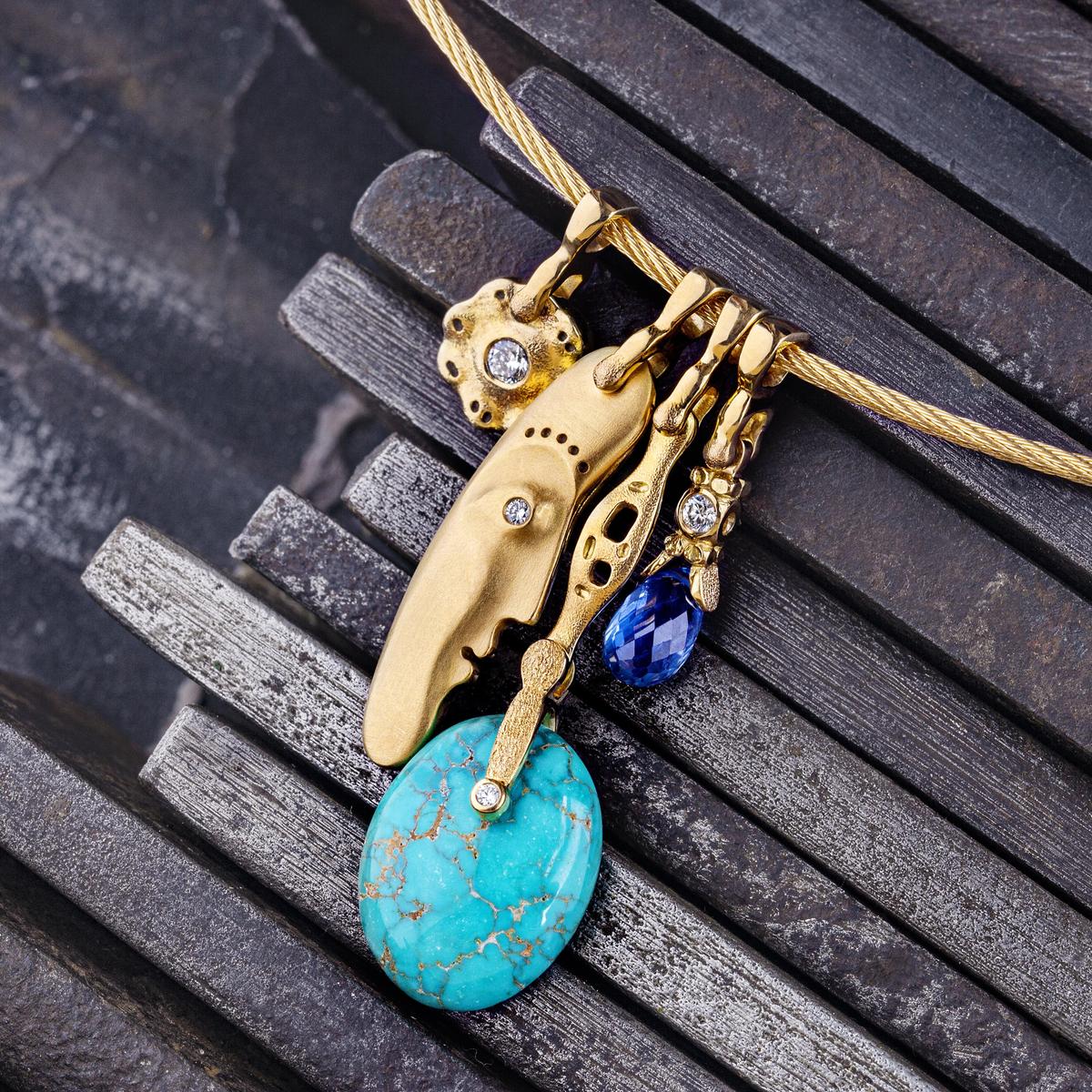 The pendant can be ordered in 18K Yellow or Rose Gold as well as Platinum. Custom color stone mixes are also available. Call for pricing on material or stone changes.