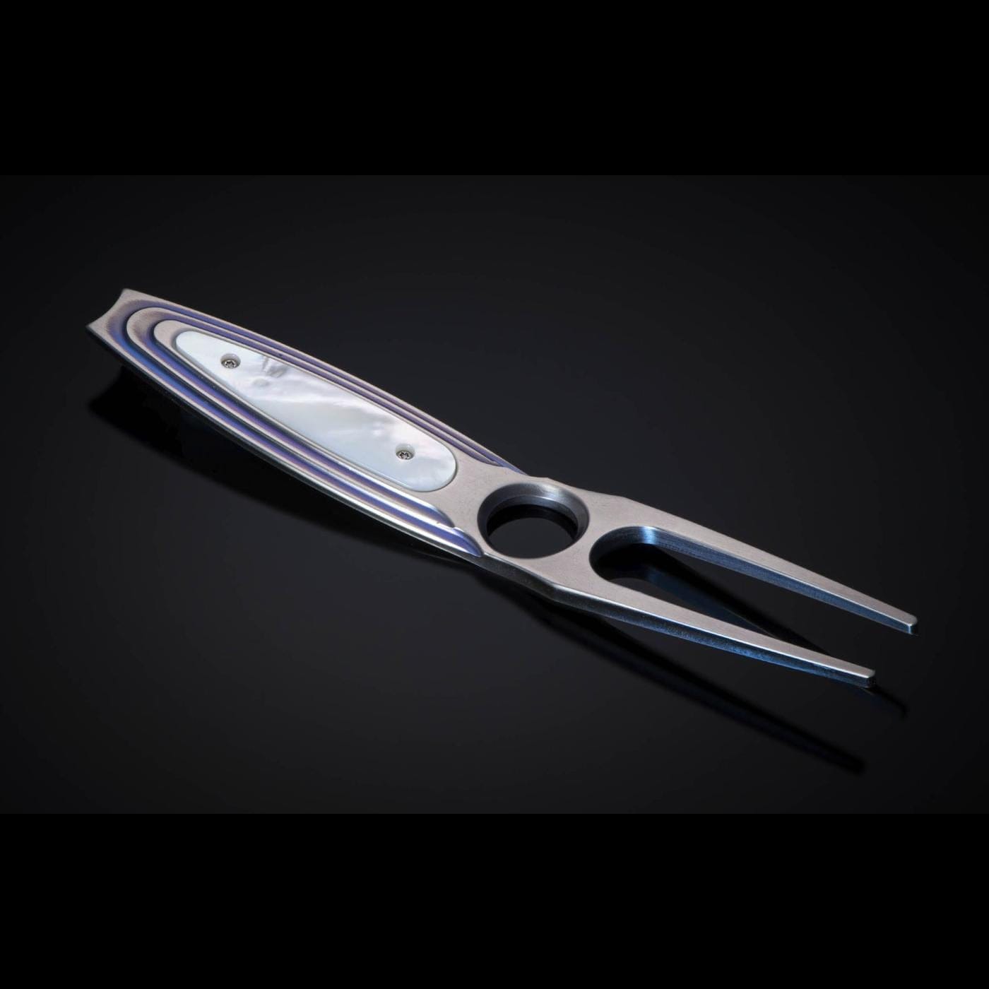 Up your game! Or at least your style while out on the links with this gorgeous divot tool from William Henry. The 'Spyglass' features a solid body machined from aerospace-grade titanium billet, anodized to a beautiful blue, and inlaid with beautiful white mother of pearl. The oversized chamfered hole gives your thumb a great resting point for control during use (and it looks cool, too).