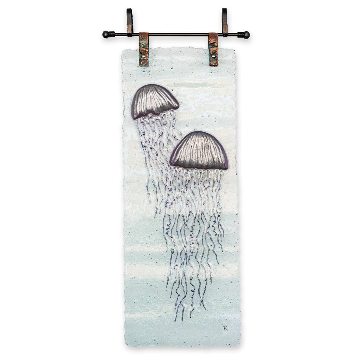 Realistically embossed with jelly fish in slightly waved clear glass complete with hanging rod / brackets and hand hammered copper straps.