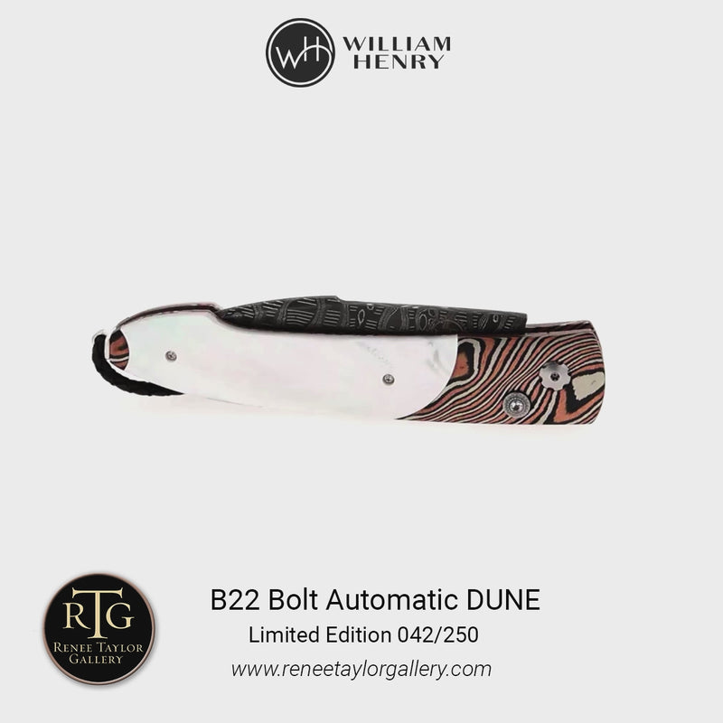 The Bolt 'Dune' delivers a fresh take on our signature pocketknives, combining a swift automatic opening blade with a secure grip for effortless daily use. True to William Henry’s philosophy, 'where superlative function meets superlative art', this model’s action has been refined to perfection, elevating your experience to a new level. Every knife is meticulously fashioned from exotic materials and hand-forged metals, and each detail reflects our commitment to timeless design and impeccable performance, making the Bolt worthy of appreciation for a lifetime.