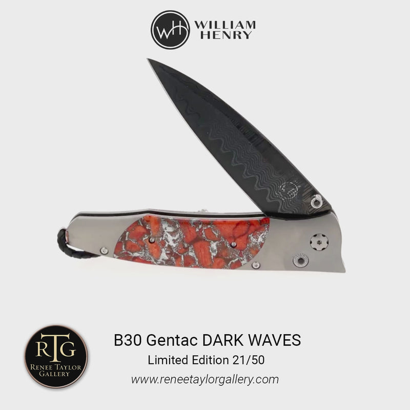 The Gentac ‘Dark Waves' features a light and resilient frame in aerospace grade titanium, inlaid with ' Zinc Matrix' apple coral. The blade is black-coated 'Wave' damascus with a core of VG-10 steel; the one-hand button lock and the thumb stud are set with spinel gemstones. An exceptional design that offers rigorous performance in a sleek, comfortable knife, the Gentac is also the perfect canvas to showcase William Henry’s range of exotic materials and techniques. The 'Dark Waves’ features some of the hi-tech materials and hand-forged metals that are the hallmark of William Henry's collections; a modern design for a timeless heirloom to be proudly worn and used for a lifetime before being handed-down to another generation.