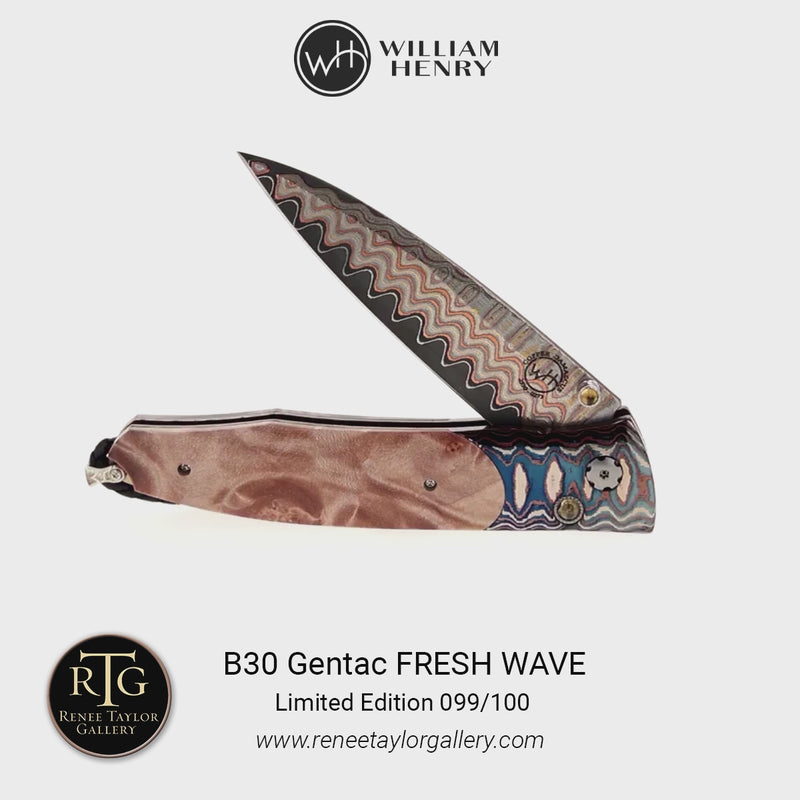 The Gentac ‘Fresh Wave’ features a beautiful frame in William Henry's signature 'Wave' mokume gane, inlaid with a beautiful piece of maple burl wood. The blade is 'Copper Wave' damascus with an extra-strong core in VG-5; the one-hand button lock and the thumb stud are set with citrine.