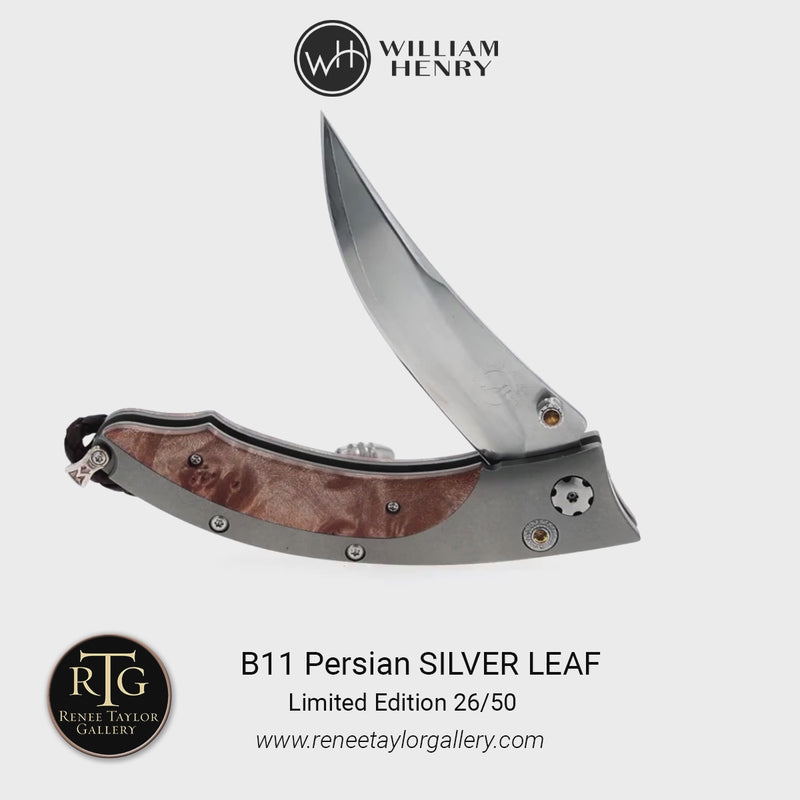 The Persian is an elegant synthesis of dramatic lines, graceful curves, and exquisite materials. A bold interpretation of a timeless design, the 'Silver Leaf' also features some of the rare exotic materials, and hand-forged metals that are the hallmark of William Henry's collections; a timeless heirloom to be proudly worn and used for a lifetime.