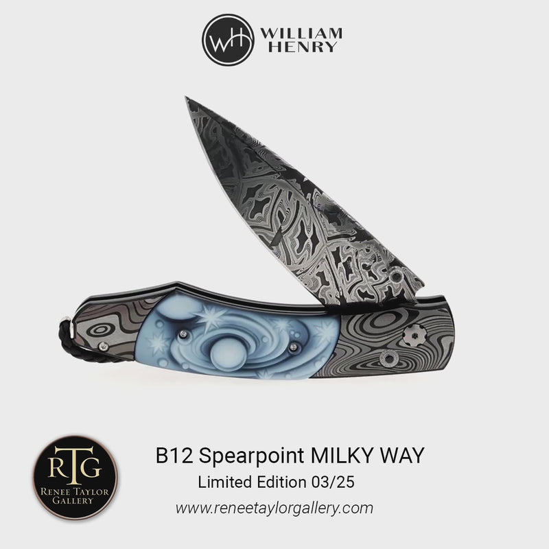 The Spearpoint 'Milky Way' features a stainless Cerakote® frame, laser engraved and inset with beautiful carved banded agate scales. The blade is hand-forged 'Mosaic' damascus by Luke Mattern; the one-hand button lock and the thumb stud are set with spinel gemstones. A remarkable design that gives you an instrument with a full-size secure grip, and a versatile deep-belly blade, the Spearpoint epitomizes William Henry’s core philosophy – that superlative function deserves to be elevated to superlative art. The ‘Milky Way’ features the artistry, hi-tech, and hand-forged metals that are the hallmark of William Henry's collections; a distinctive personality statement to be worn and used for a lifetime.