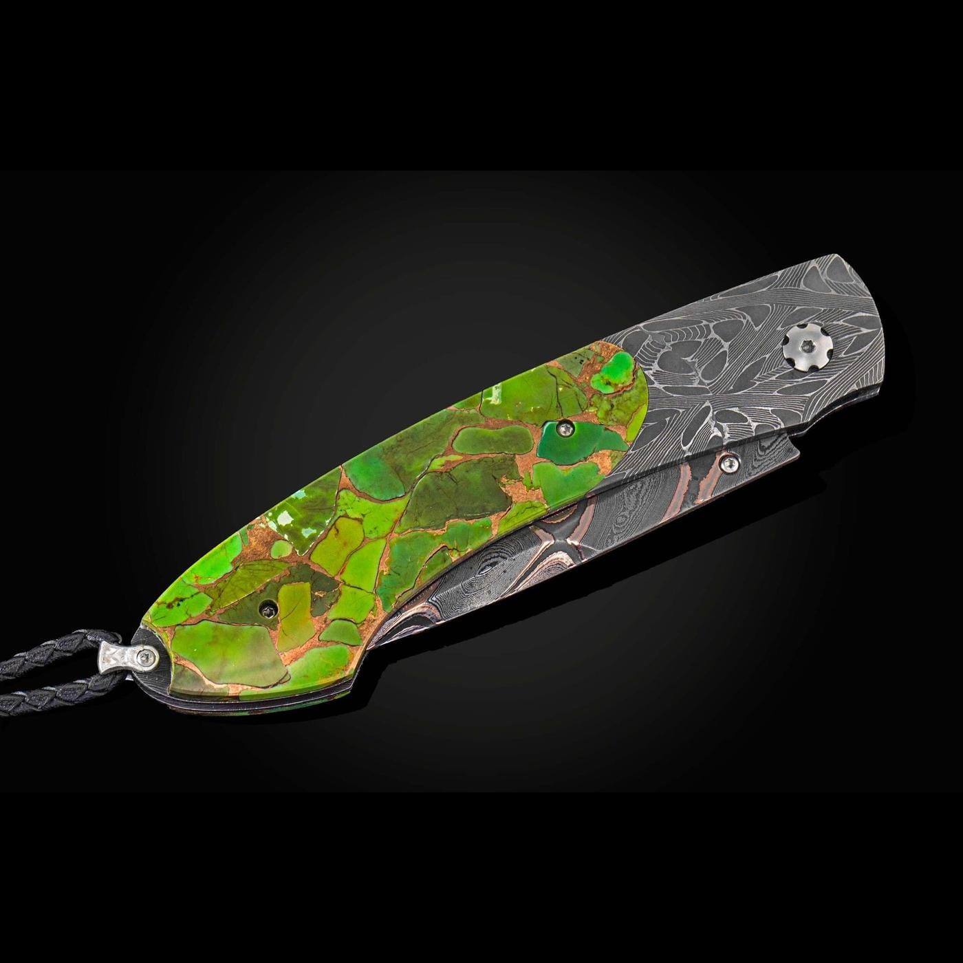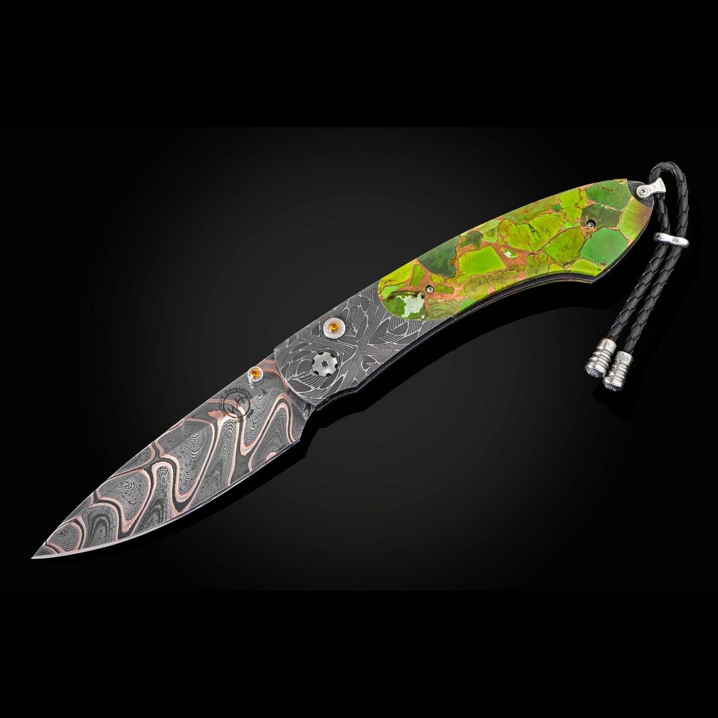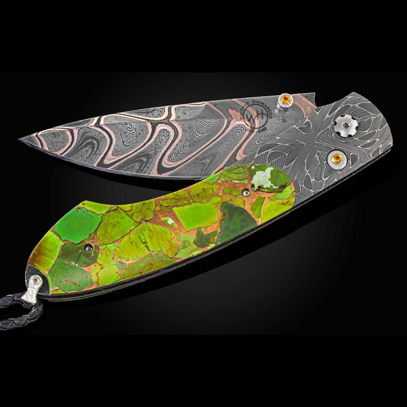 The Spearpoint ‘Sedona Vortex’ features a frame in hand-forged 'X Out' damascus, inlaid with Green Mojave Turquoise inlaid with copper. The blade is hand forged 'Rip Tide' damascus, by Baker Forge; the one-hand button lock and the thumb stud are set with citrines.
