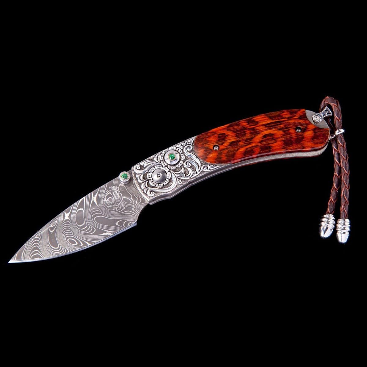 The Kestrel 'Weston' features a beautiful frame in hand-carved sterling silver, inlaid with snakewood scales. The blade is hand-forged 'Boomerang' damascus by Chad Nichols; the one-hand button lock and the thumb stud are set with Rainforest topaz gems.