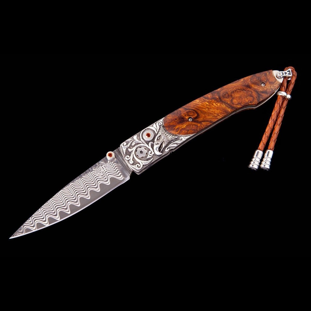 The Lancet 'Free Flight' features a bolster in hand-carved sterling silver, inlaid with a stunning piece of desert ironwood. The razor-sharp blade is 'wave' damascus steel with core in ZDP-189; the one-hand button lock and the thumb stud are set with citrines.