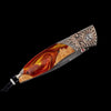 The Omni 'Flame' features a frame in hand-forged mokume gane by Mike Sakmar, and inlaid with a beautiful natural wood and resin hybrid. The blade is hand-forged 'Hornets Nest' damascus by Mike Norris. The ambidextrous thumb stud is inset with corundum ruby gemstones.