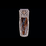 Hand-carved sterling silver and Mokume Gane, inlaid with 10,000-year-old fossil Woolly Mammoth tooth.