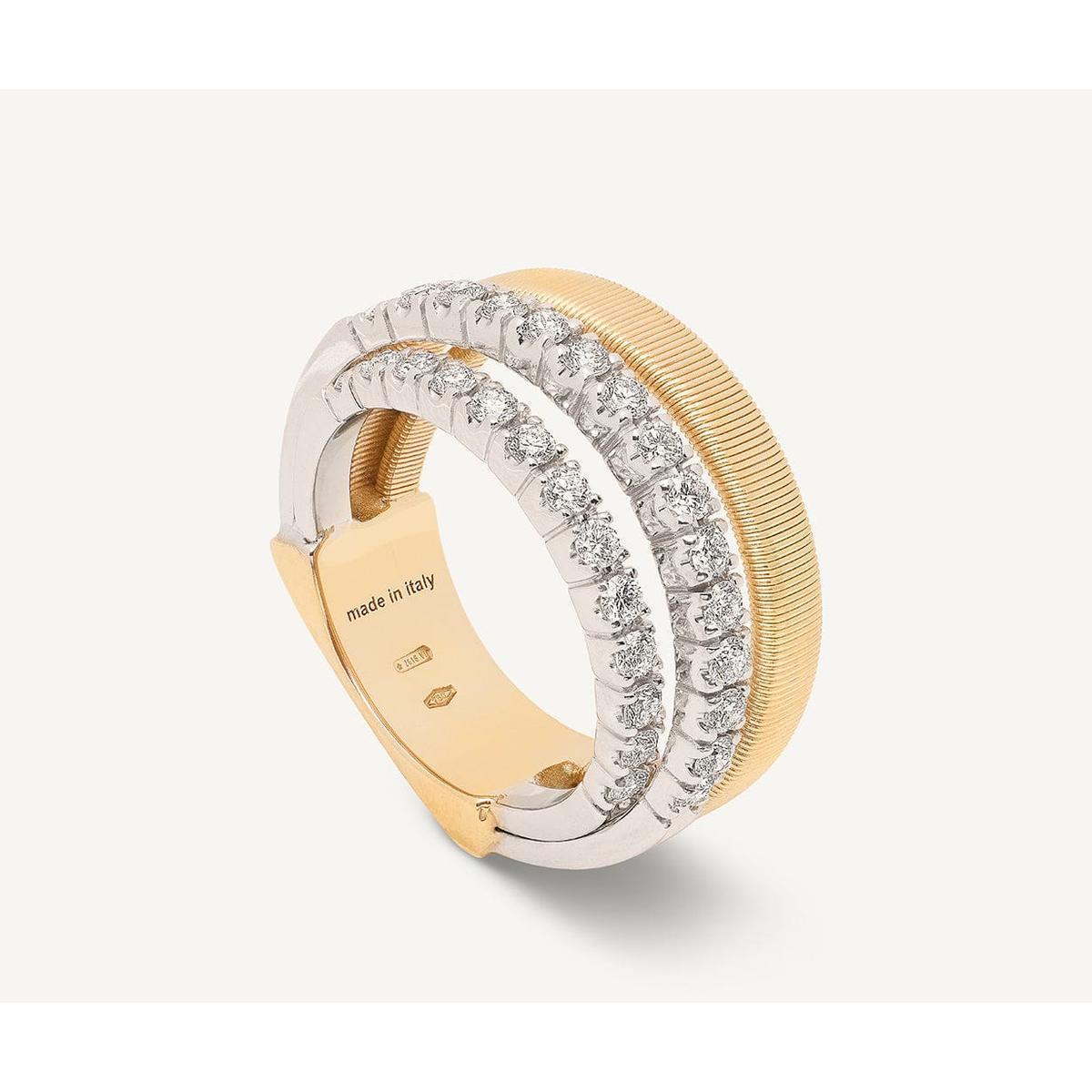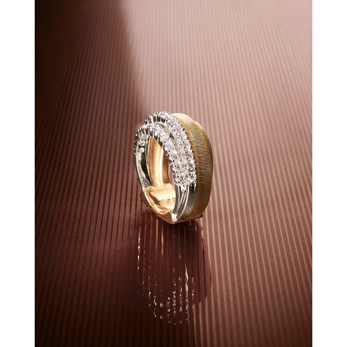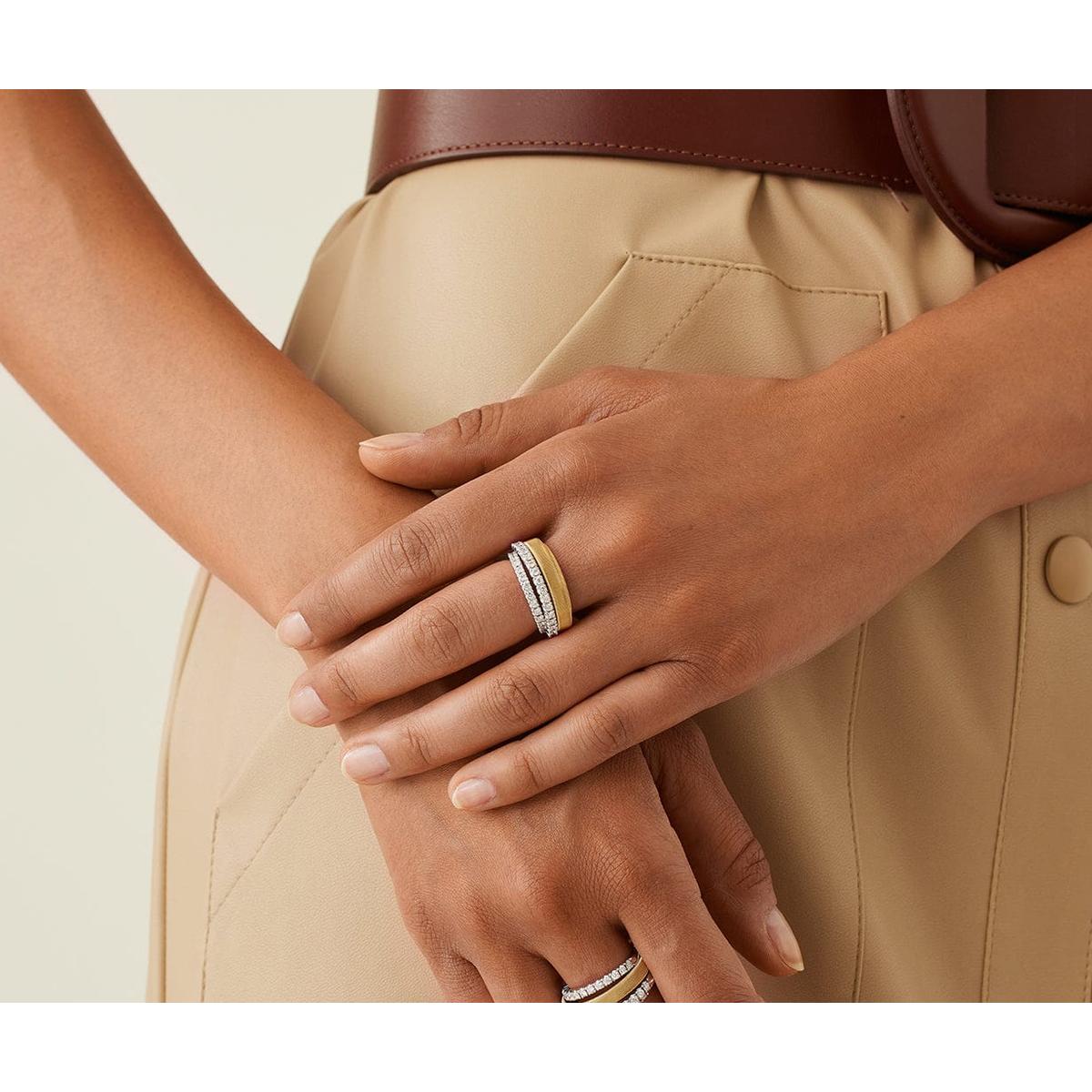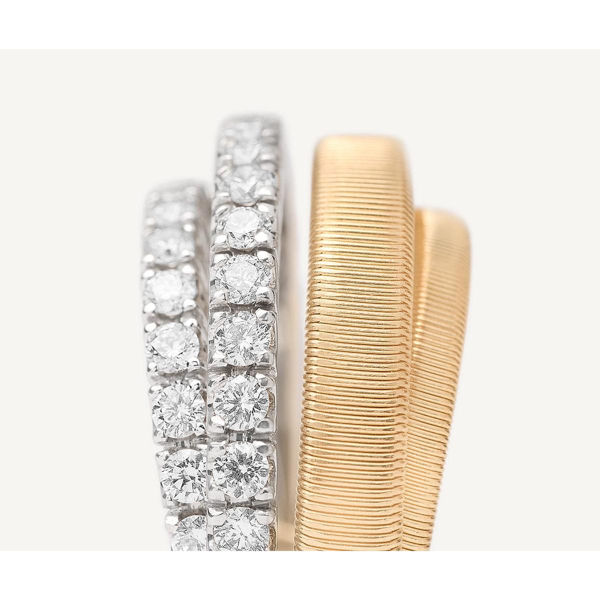 Two brilliant-cut diamond pavé bands meet two flat spiral threads, carefully created with our exclusive coil technique. A perfect interweaving for this elegant and sophisticated 18K yellow gold ring, a real must-have with timeless appeal.