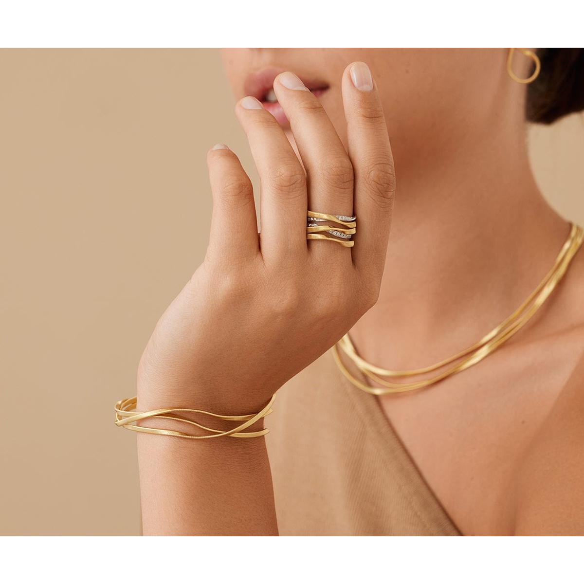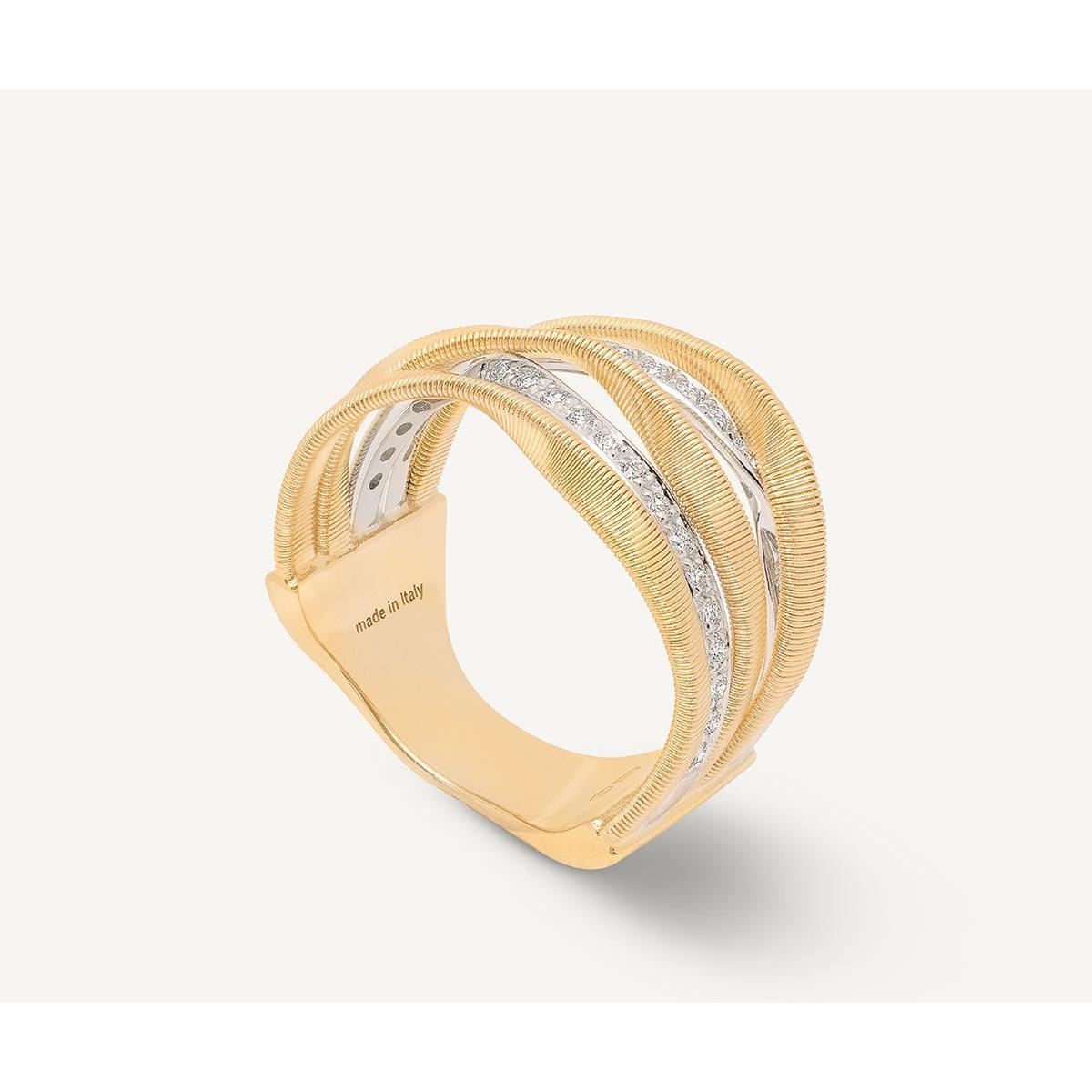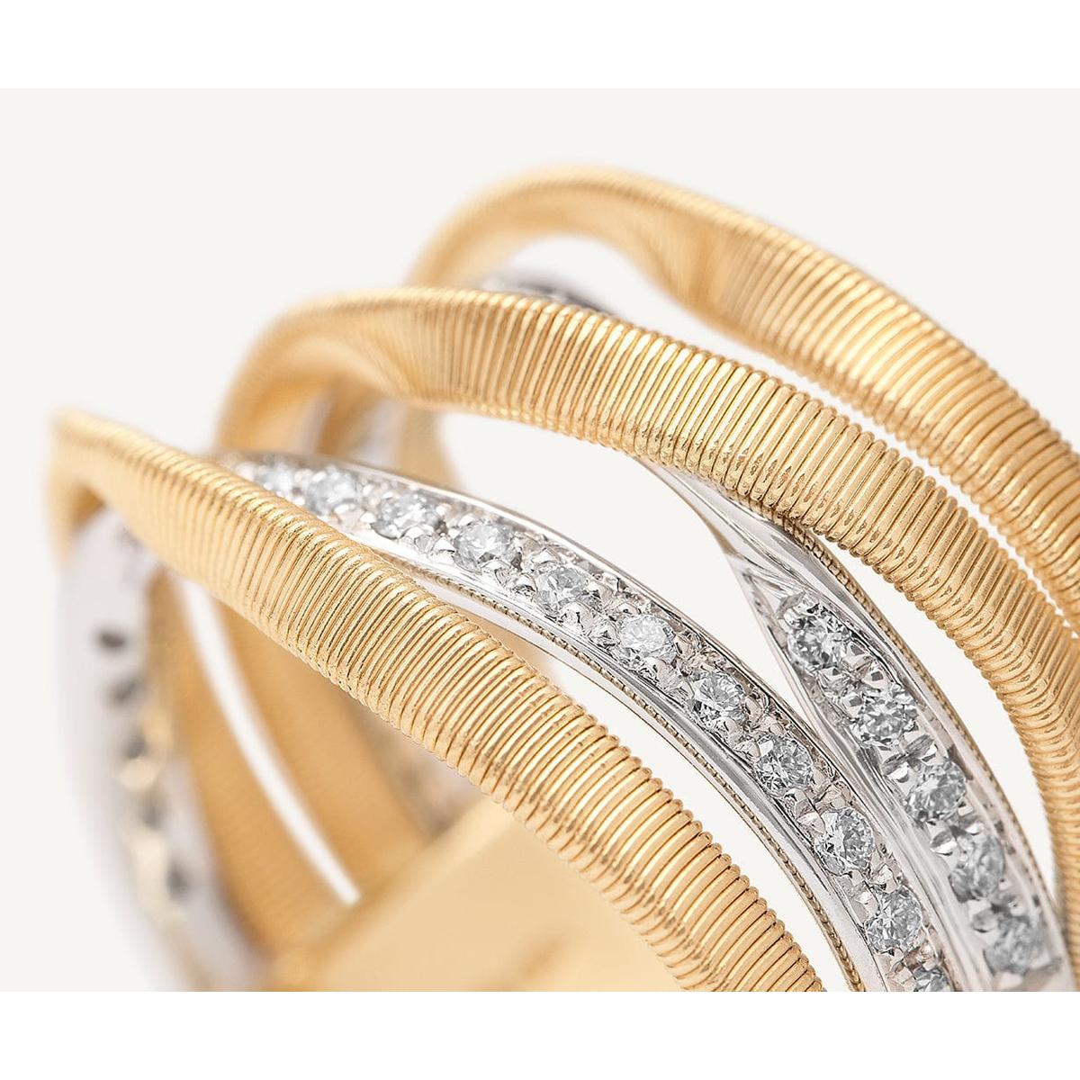 The refined design of this 18K yellow gold ring makes it a precious accessory to wear every day. Five strands of twisted coil alternate with two brilliant-cut diamond pavé bands, creating a mesmerizing combination of textures and colors.