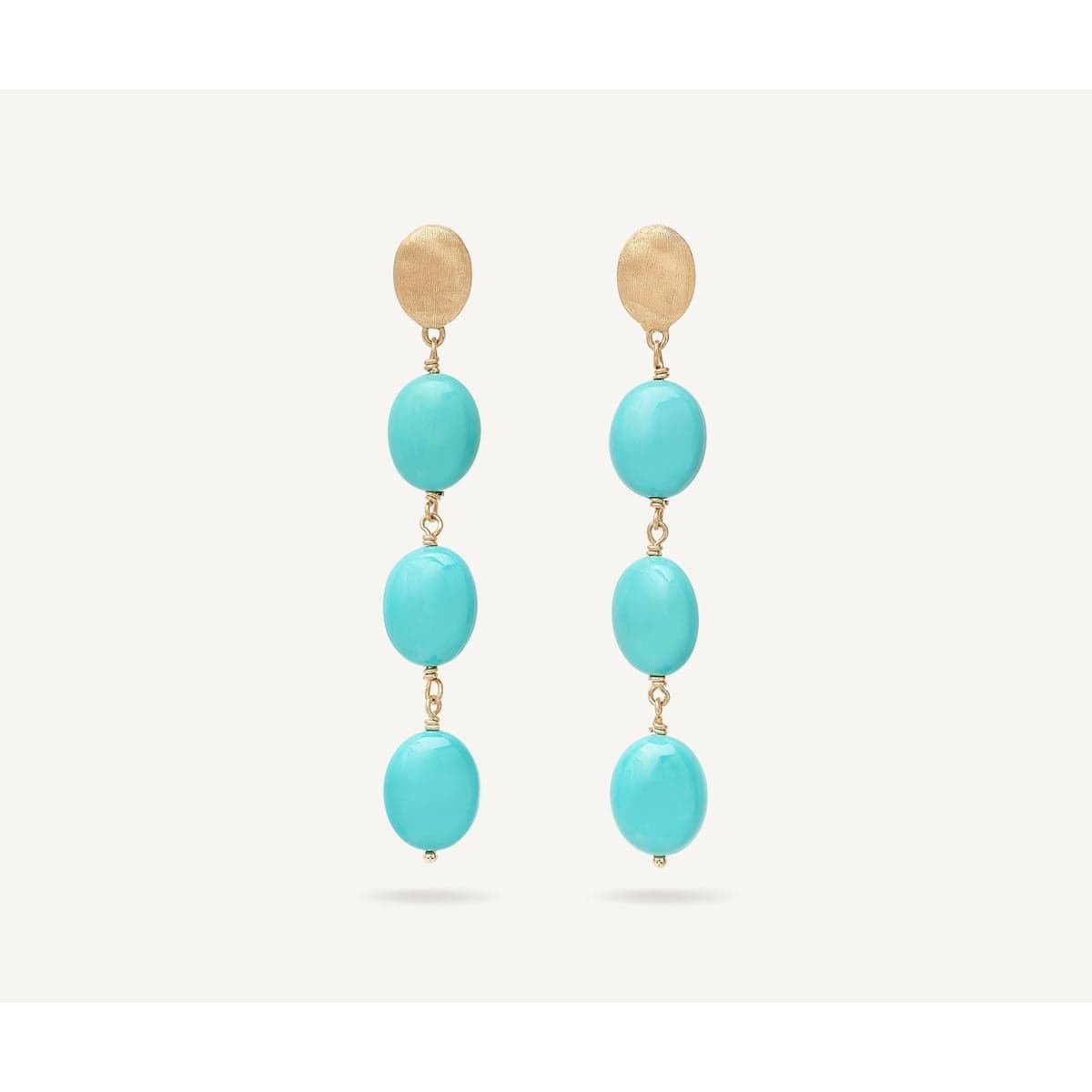 These statement earrings feature a series of oval cabochon turquoise gemstone drops, anchored by a hand engraved golden bead at the lobe. Perfect for any occasion, they can add a vibrant flair to any ensemble.