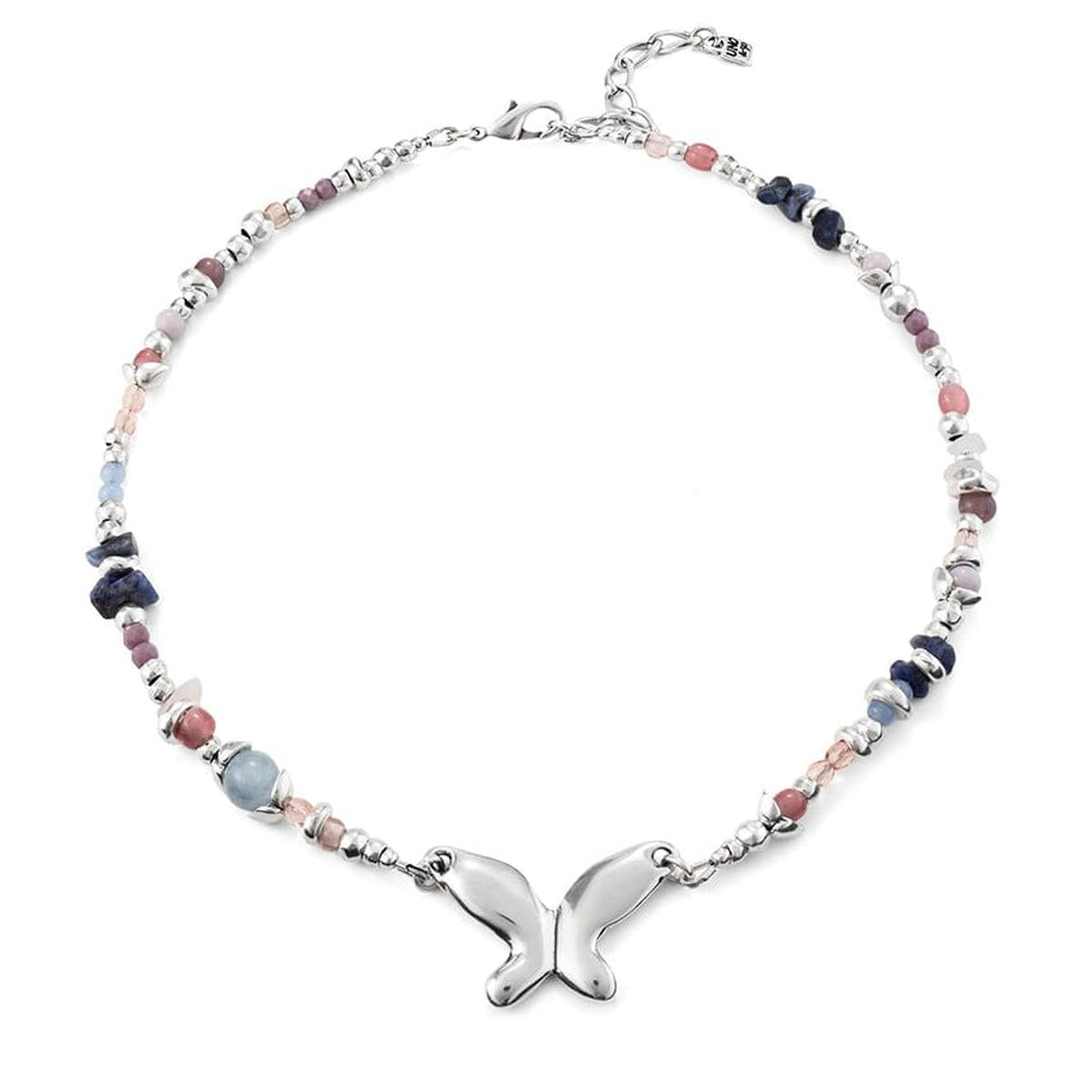 Short sterling silver-plated necklace that combines beads and multicolored crystals with a central butterfly. Adjustable carabiner clasp.