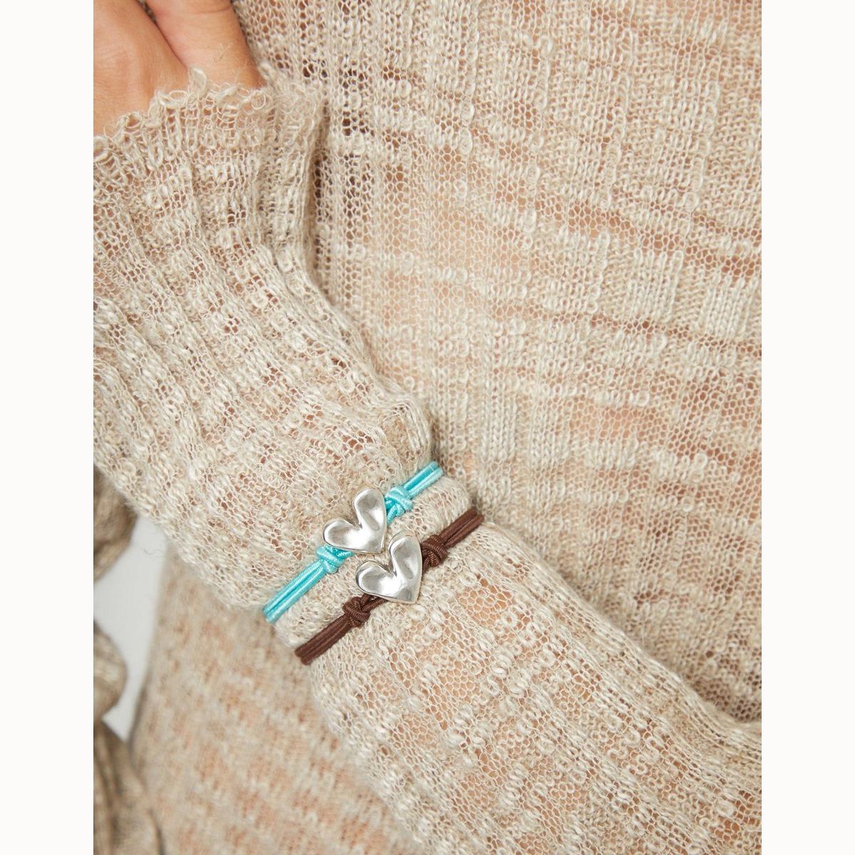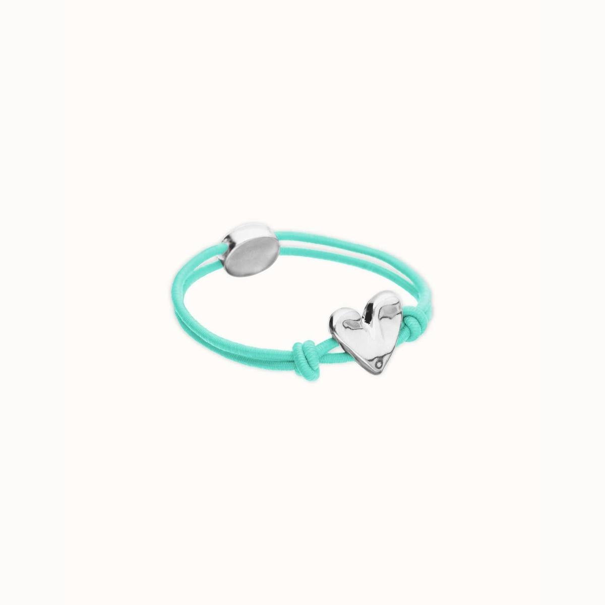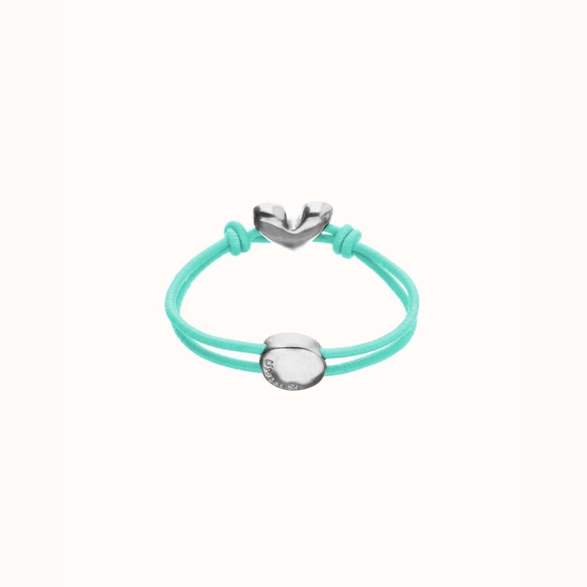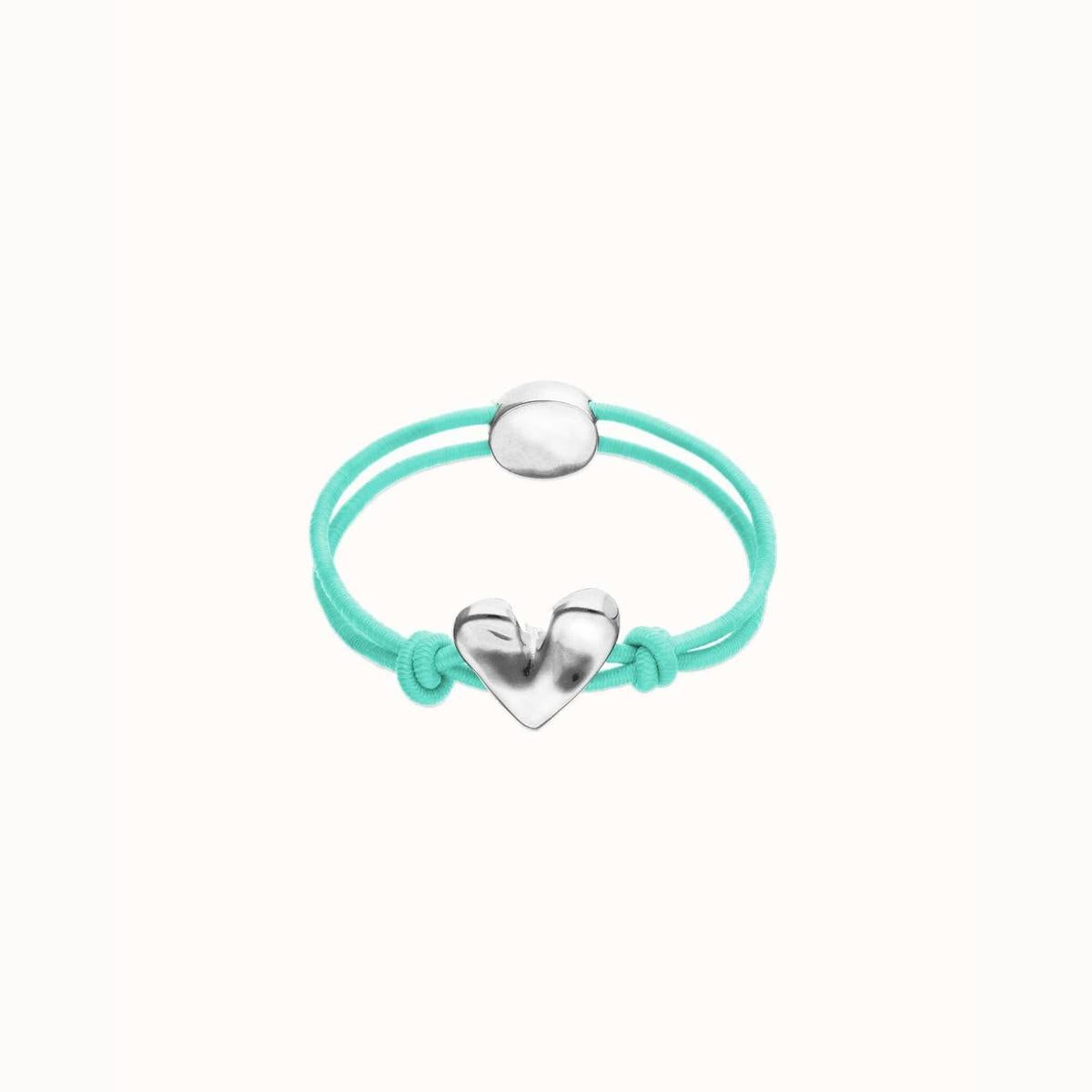 Turquoise elastic thread bracelet with heart charm. When something inside you beats strongly, there is only one way to listen to it: let go. The Beat Collection is a celebration of letting go of the reins and letting your heart lead the way. A handmade heart, imperfect, but real. Because the result of living this way is a heart sculpted with your own hands.