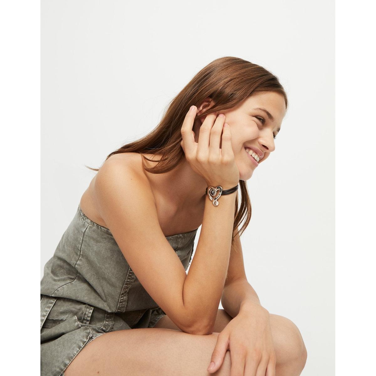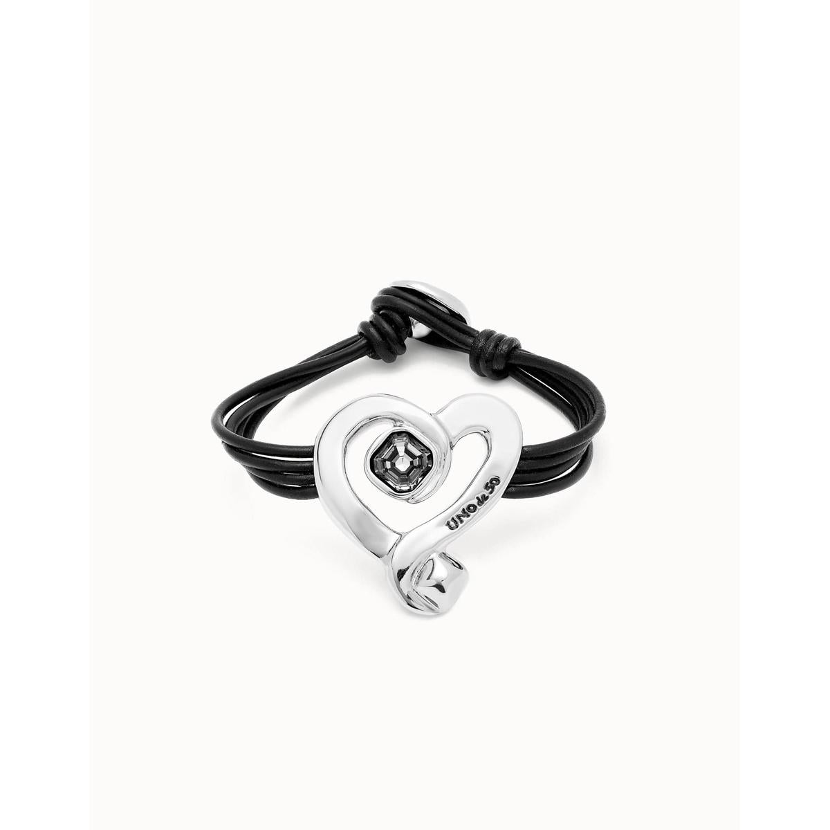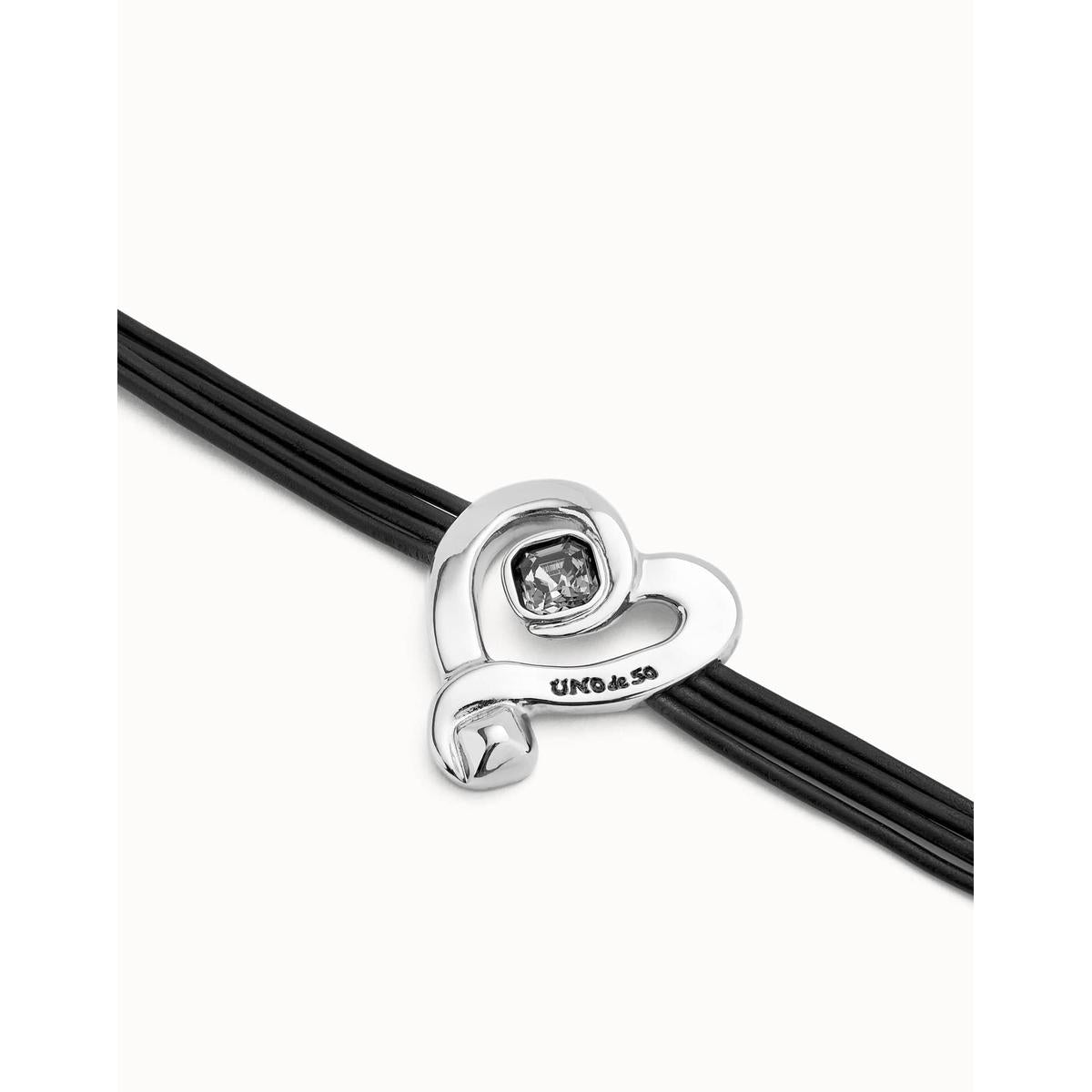 Leather Bracelet with Sterling Silver-Plated Heart and Black Crystal - PUL2542NGRMTL