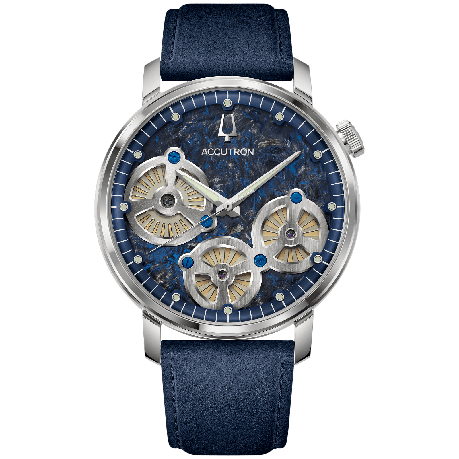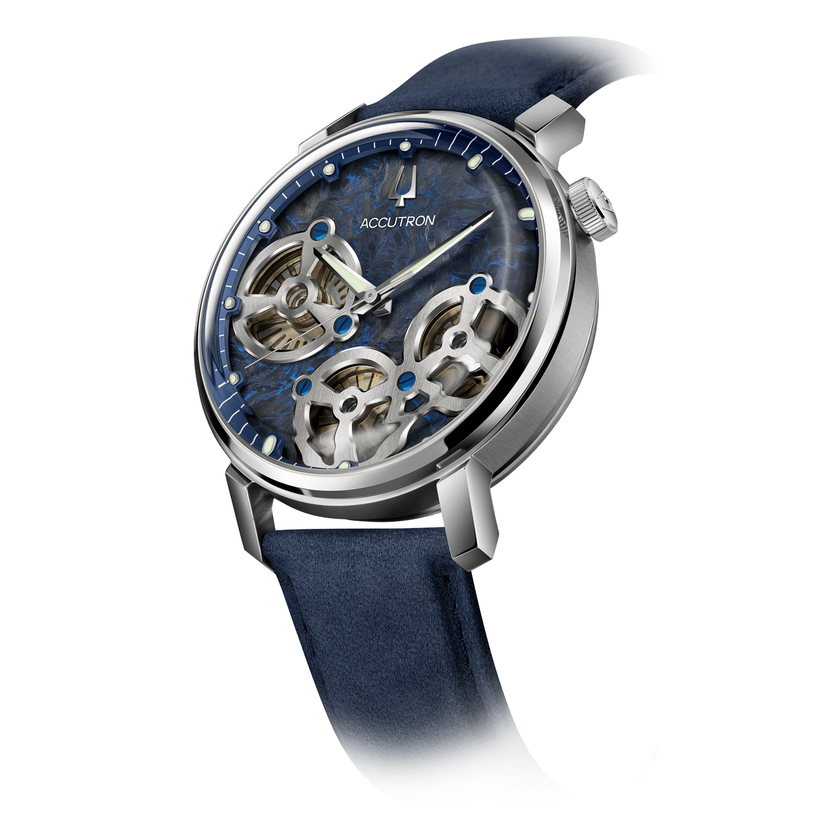 Accutron breaks the mold again with the Spaceview Evolution, now featuring striking forged carbon dials. An enigmatic swirl of color, the visual impact of the blue forged carbon dial is enhanced by a new closed dial. The remaining apertures allow the wearer to admire the forged carbon’s evocative pattern as it sits in juxtaposition to the iconic spinning turbines and their silver-tone bridges and blue screws, while luminous hands and hour markers offer ideal legibility. Underpinning the exceptional dial is the groundbreaking NS30 electrostatic movement, the first of its kind, which is powered by twin turbines that harness energy created by even the slightest movement and deliver accuracy of -/+5 seconds per month. Housed in a stainless-steel case with a sapphire crystal and a matching luxurious navy suede strap with a folding clasp, the Accutron Spaceview Evolution Forged Carbon marks the latest in the ongoing story of the Electrostatic collection.