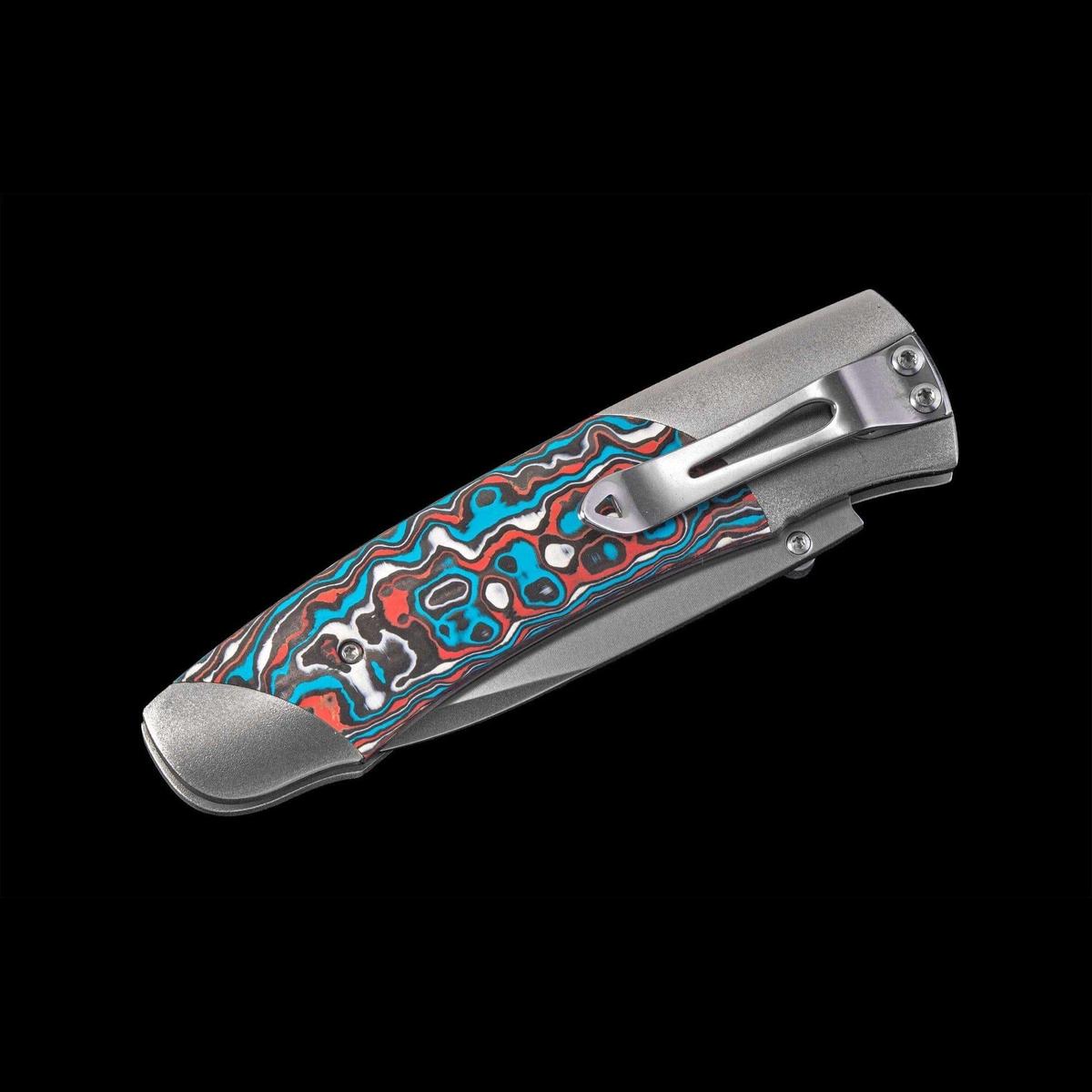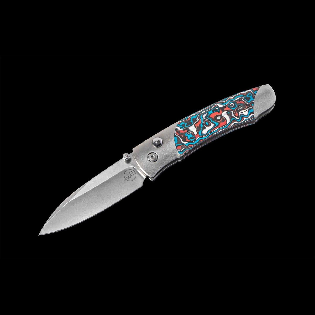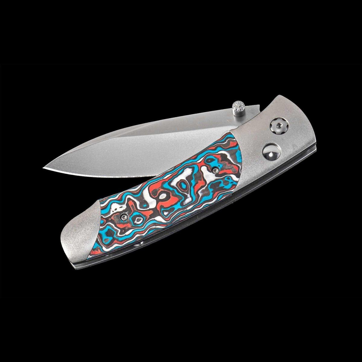 William Henry’s A200-11 expands on our tradition of fine folding knives with a design that has a little attitude, a lot of finesse, and remarkable utility in a compact and lightweight package. Each blade is crafted from S35VN stainless steel honed to a razor edge. The frame is hand-finished aircraft grade titanium inlaid with 'Flame Ocean' carbon fiber. Finished with a stainless clip and stainless fittings.