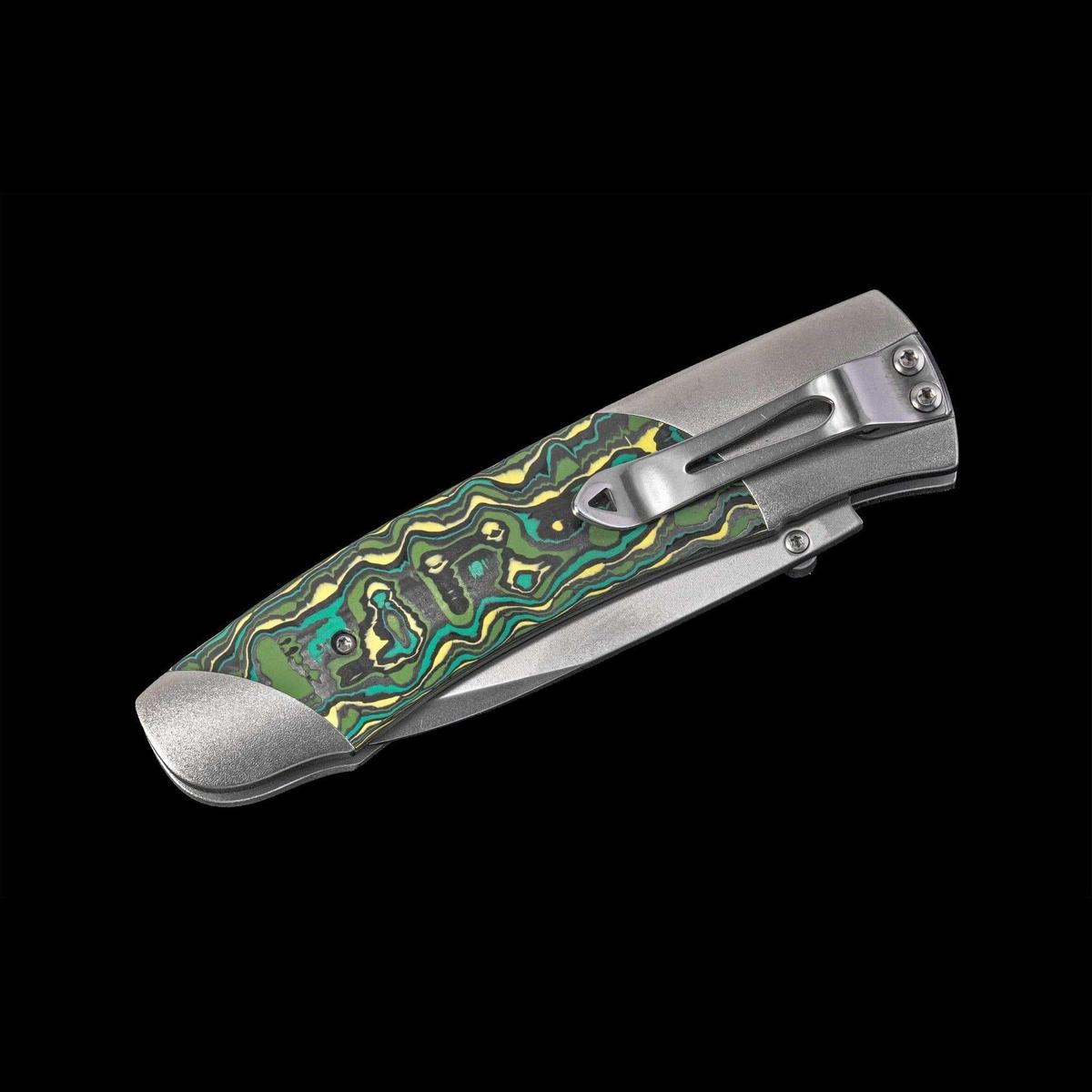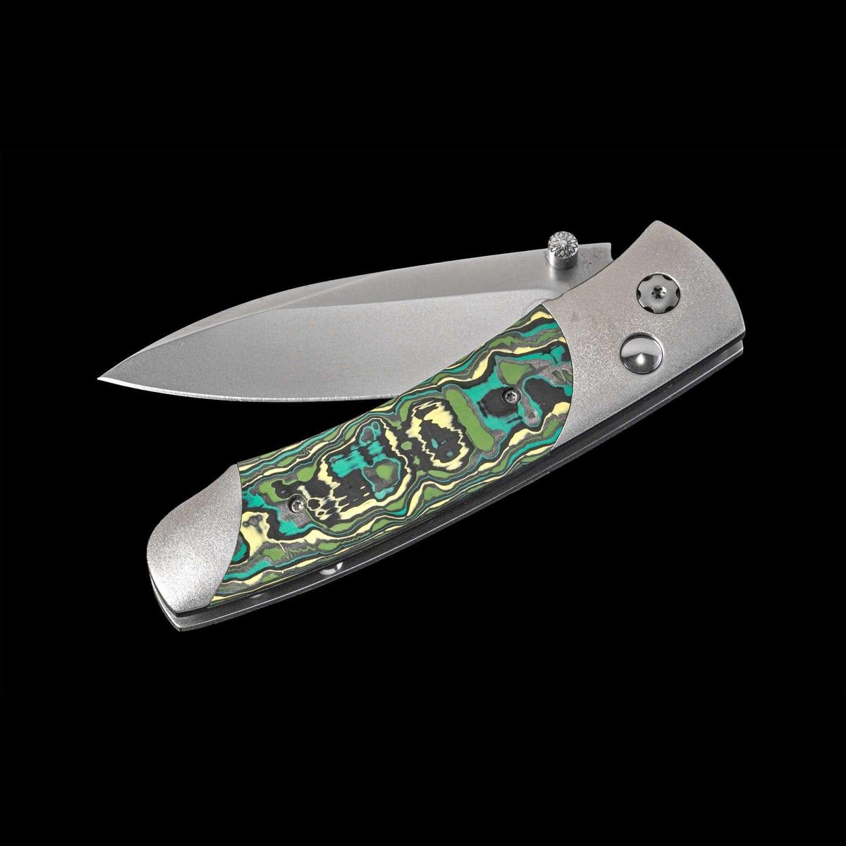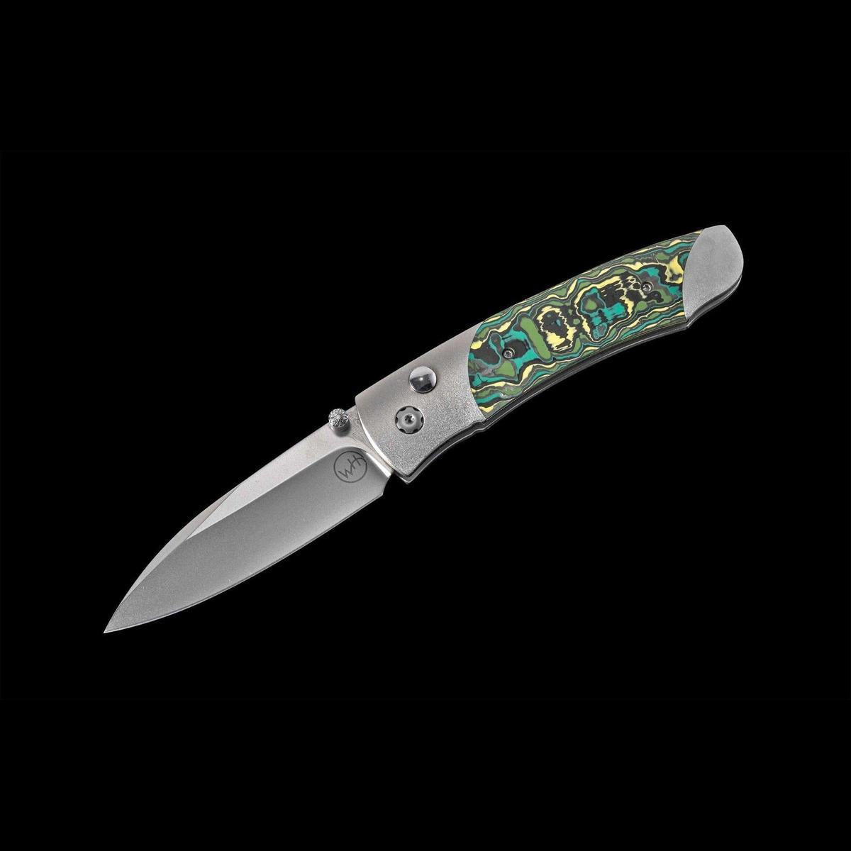 William Henry’s A200-12 expands on our tradition of fine folding knives with a design that has a little attitude, a lot of finesse, and remarkable utility in a compact and lightweight package. Each blade is crafted from S35VN stainless steel honed to a razor edge. The frame is hand-finished aircraft grade titanium inlaid with 'Flame Ocean' carbon fiber. Finished with a stainless clip and stainless fittings.