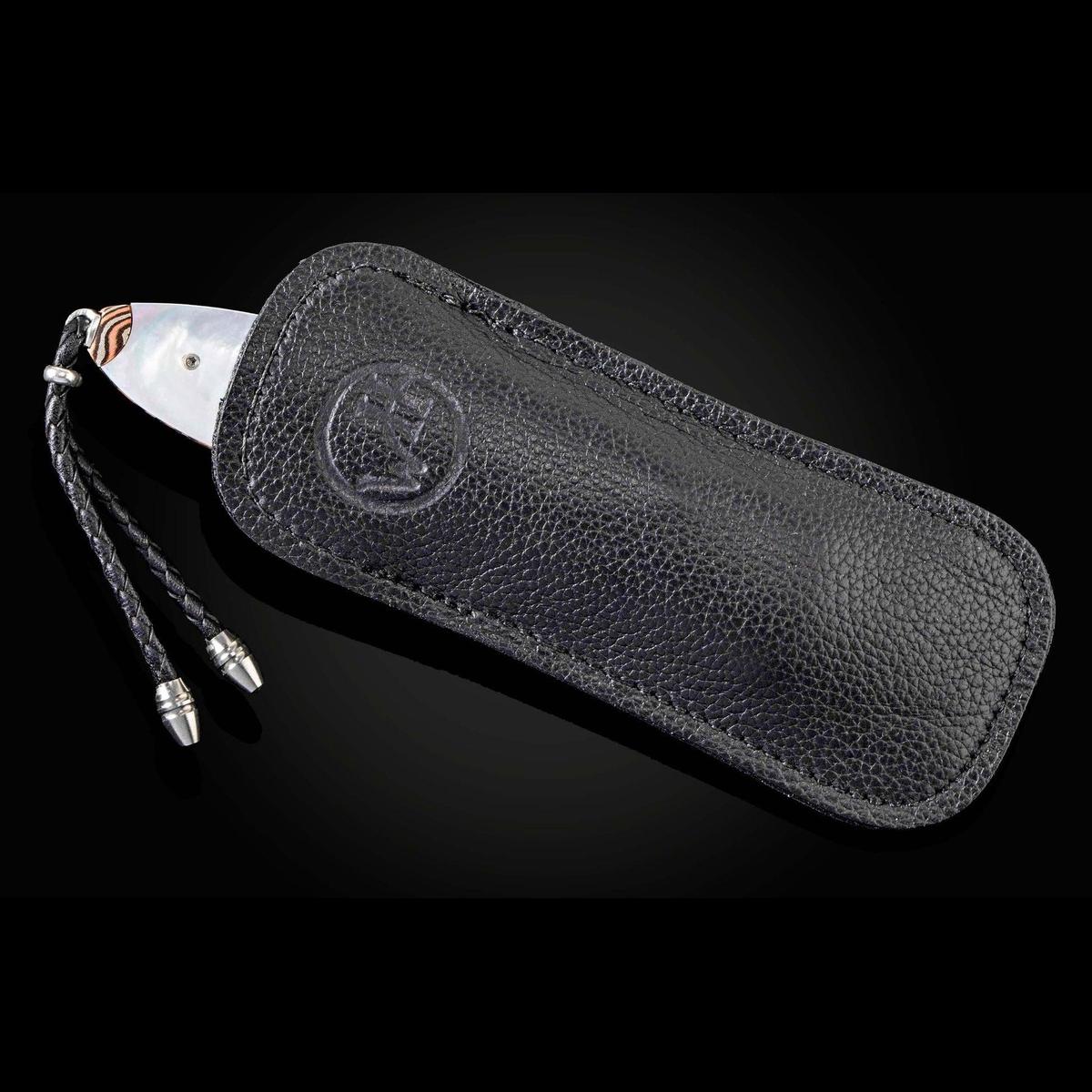 The Bolt 'Dune' automatic opener features a frame in hand forged 'Twist' mokume gane by Mike Sakmar, inlaid with beautiful mother of pearl scales. The blade is hand-forged 'Hornets Nest' damascus steel by Mike Norris. The one-hand button lock is set with a white topaz gemstone.