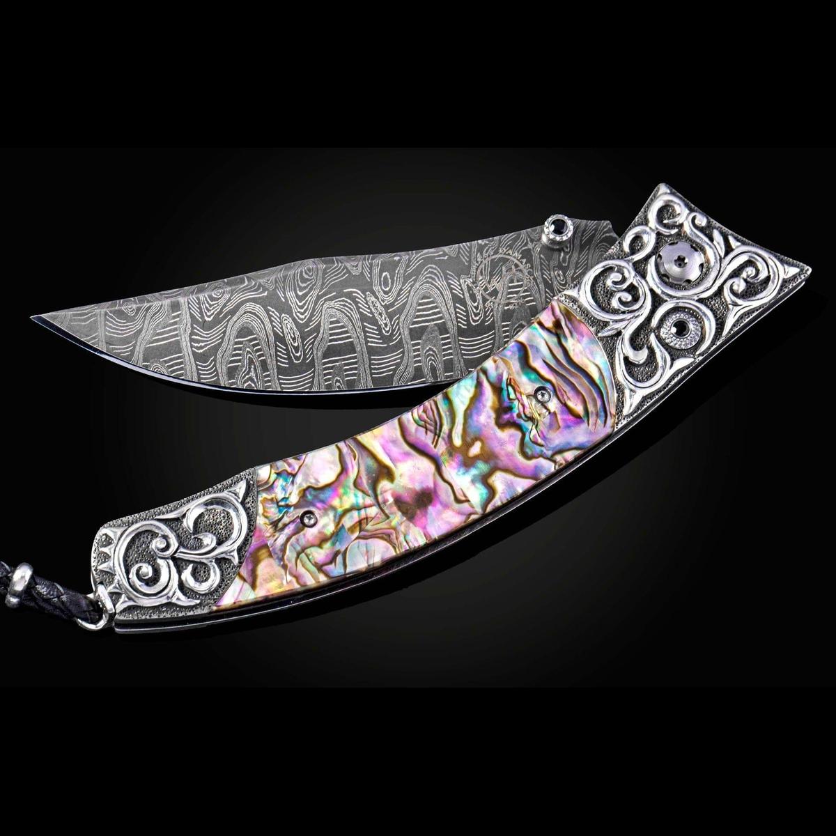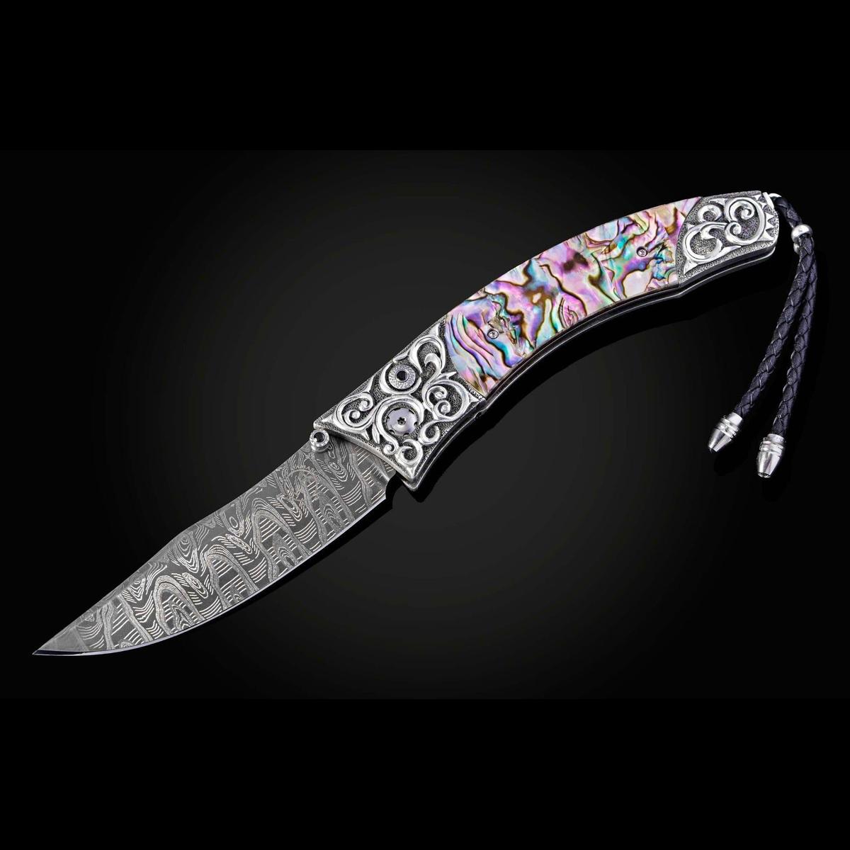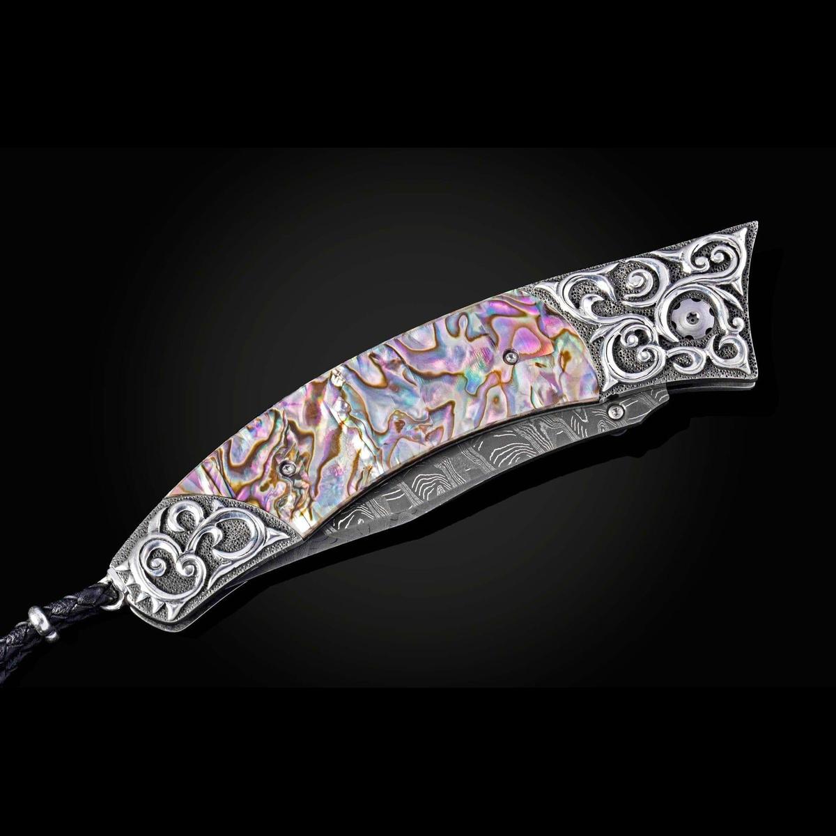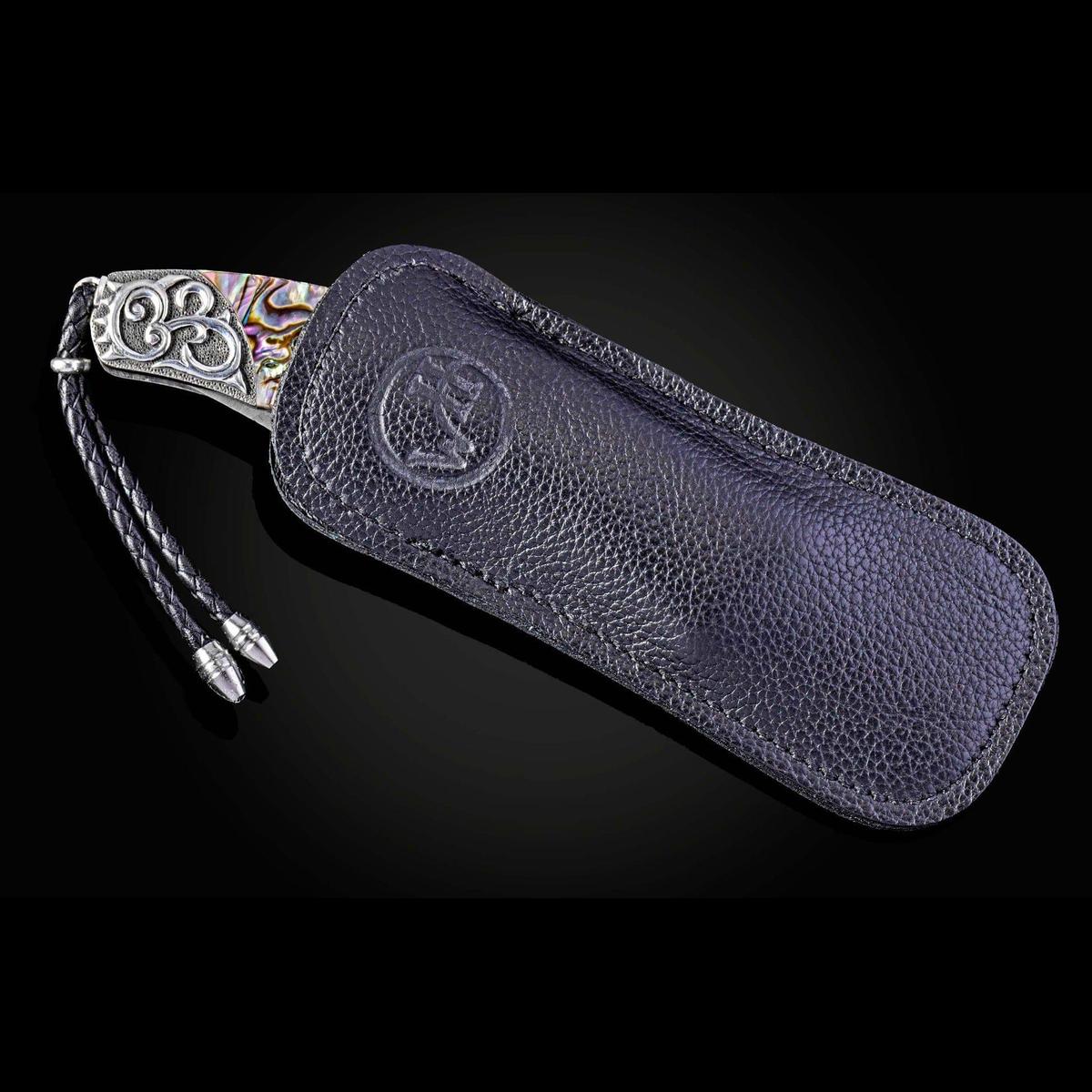 Folding knife with abalone and hand-carved sterling silver