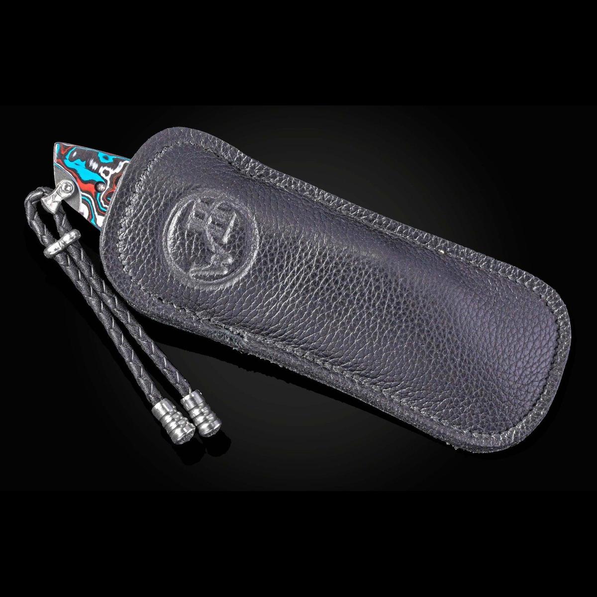 The Omni 'Freedom' features a frame in aerospace grade titanium, inlaid with red, white, and blue G10 scales. The blade is hand-forged 'Intrepid' damascus by Chad Nichols. The ambidextrous thumb stud is inset with a white topaz gemstone.
