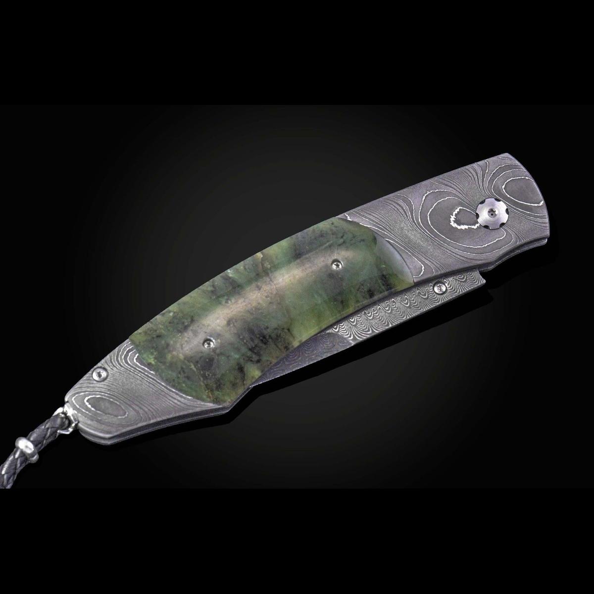 The Spearpoint ‘Green Hills’ features a mesmerizing frame of hand-forged 'Twist' damascus by Chad Nichols, inlaid with a stunning piece of green jade. The blade is hand-forged 'Turkish' damascus by Luke Mattern; the one-hand button lock and the thumb stud are set with spinel gemstones.