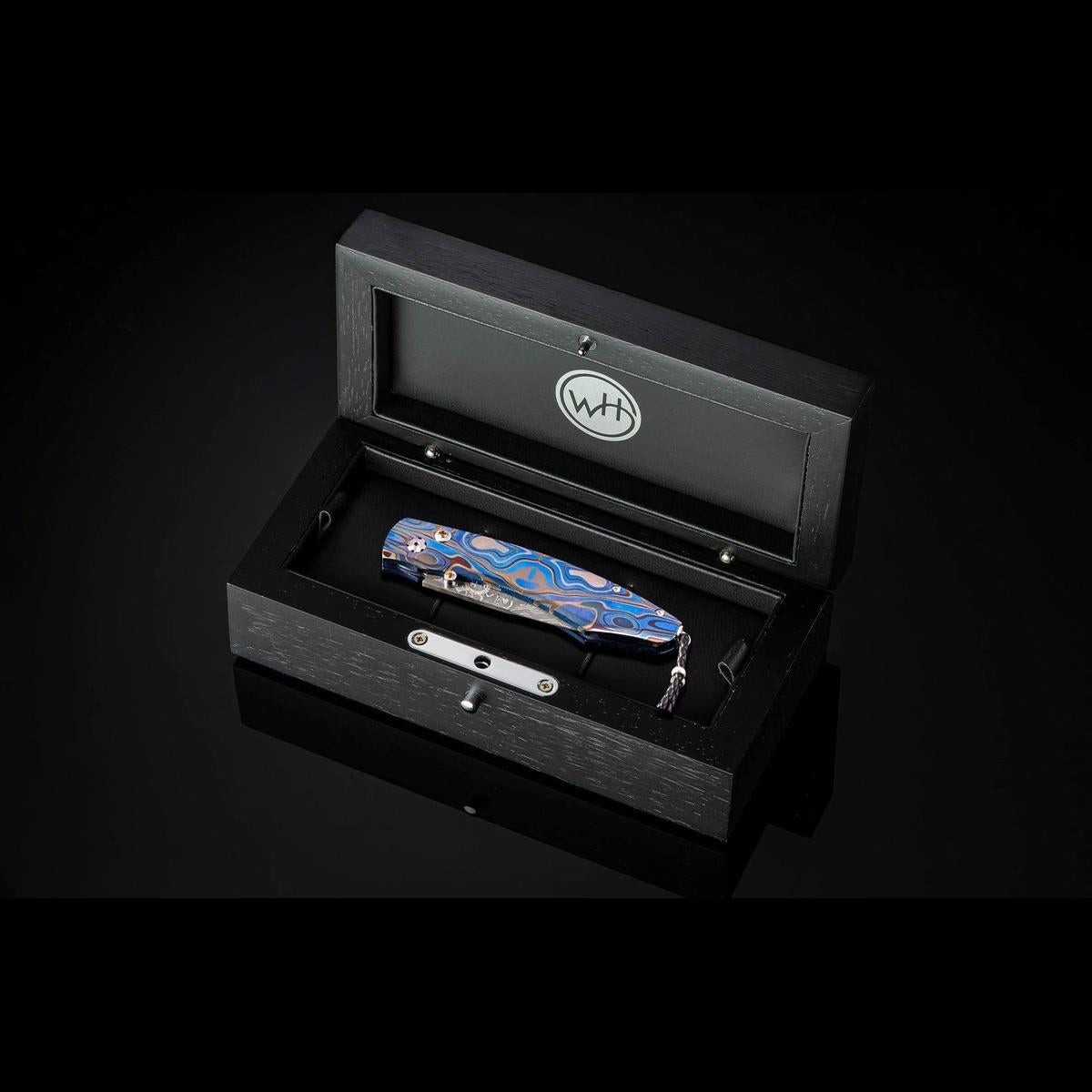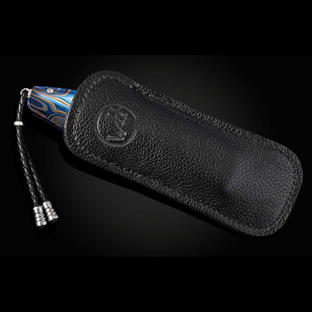 The Spearpoint ‘Maelstrom’ features a light and resilient titanium frame, anodized blue and laser engraved. The blade is hand-forged 'Intrepid' damascus by Chad Nichols; the one-hand button lock and the thumb stud are set with citrine gemstones. A remarkable design that gives you an instrument with a full-size secure grip, and a versatile deep-belly blade, the