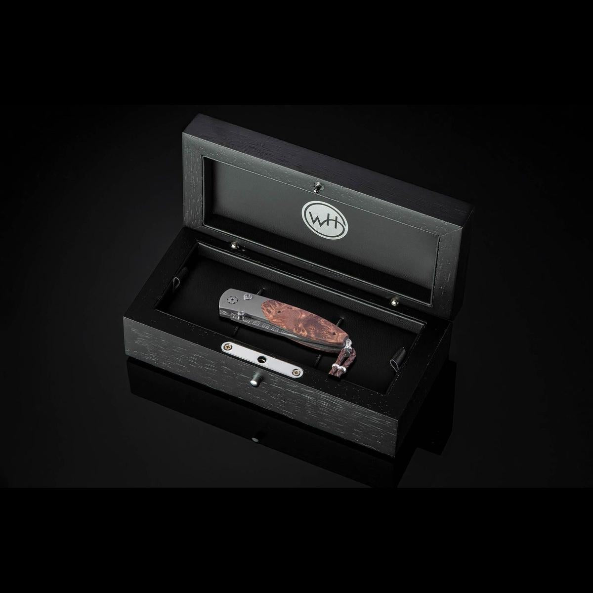 The Monarch 'Wavy Burl' features lightweight but sturdy handle in titanium, inlaid with Redwood burl. The blade is 'Wave' damascus steel with an extra strong core in VG-10; the one-hand button lock and the thumb stud are set with white topaz gemstones.The Monarch is a simple design that is easy on the eye and effortless in the hand; the elegant shape of the handle on this design is also an ideal canvas to showcase fine hand-engraving or exotic materials. The 'Wavy Burl' features the rich and unique synthesis between function, exotic materials, and the superlative artistry that is the hallmark of William Henry's collection.